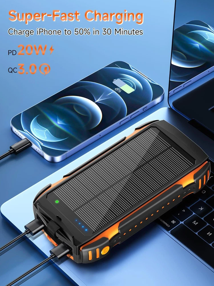 [6 Ports+ Wireless Charging]: Cell phone charger have 6 ports, 18W Type-c(support input/output), 18W mic-usb for input, 4 USB for output(USB1 18W. These 3 are all 15W), which means you can charge 6 devices at same time, Also 10W QI wireless charging function support all qi-enabled mobile devices [30,000 mAh Huge Capacity]: Our solar battery charger equipped with 30,000 mAh amazing battery, it’s enough to charge an phone 11 for 7.2 times, a Galaxy S10 for 6.6 times, an iPad mini5 for 4.5 times. even during hurricanes and unexpected power outages. It can automatically adjust the output to provide the appropriate current to ensure that your device is free from overcharge and short circuit. But the solar phone charger can't be brought on the plane. [ Dual Input Ports]: Solar charger power bank with micro input port and type-c input & output port(9V/3A quick charging input type c). Our solar charger's input current can reach 9V/2A, which is twice faster than other solar phone charger. At the same time, it supports solar energy input. It is very suitable for outside activities such as camping, and other emergency use. [4 Lighting Modes]: Solar battery pack built-in two 1W flashlight spotlights, single lumen 150, range 40 meters, four lighting modes: ① strong light; ②dim light; ③warning light; ④ SOS mode. Portable solar charger can be used as night light in the dark. It is very suitable for outdoor fanatics, and other emergency situations. [Outdoor-Specific Material]: Portable solar charger is made of durable materials, it has a very strong resistance to impact (1.2 meters drop) Test) is very suitable for outdoor use. The solar phone charger is equipped with a Carabiner, which you can hang on your bag while climbing the mountain and use the solar energy to charge the solar battery charger.