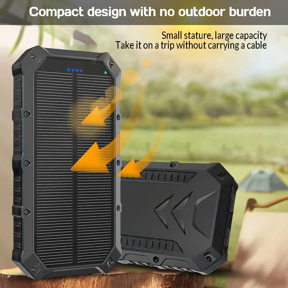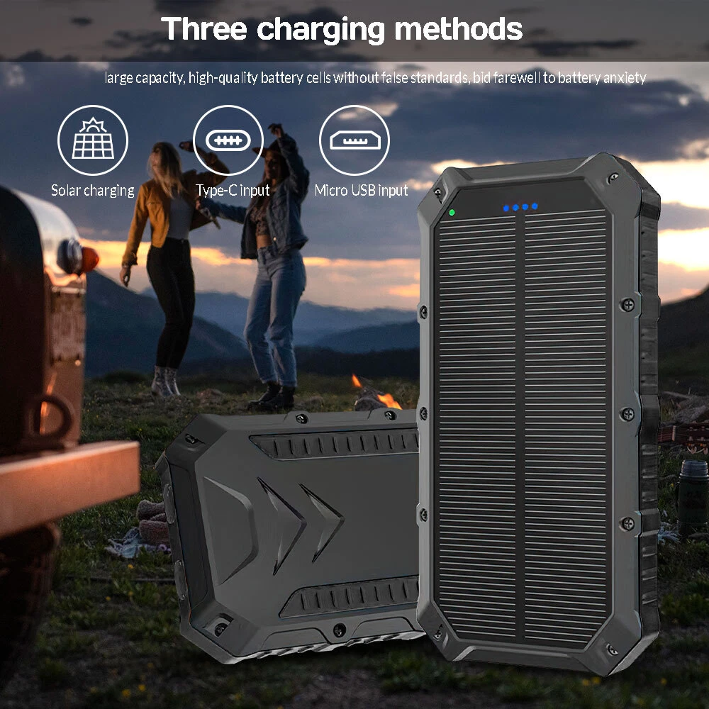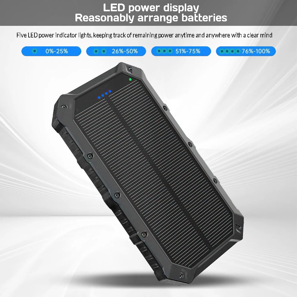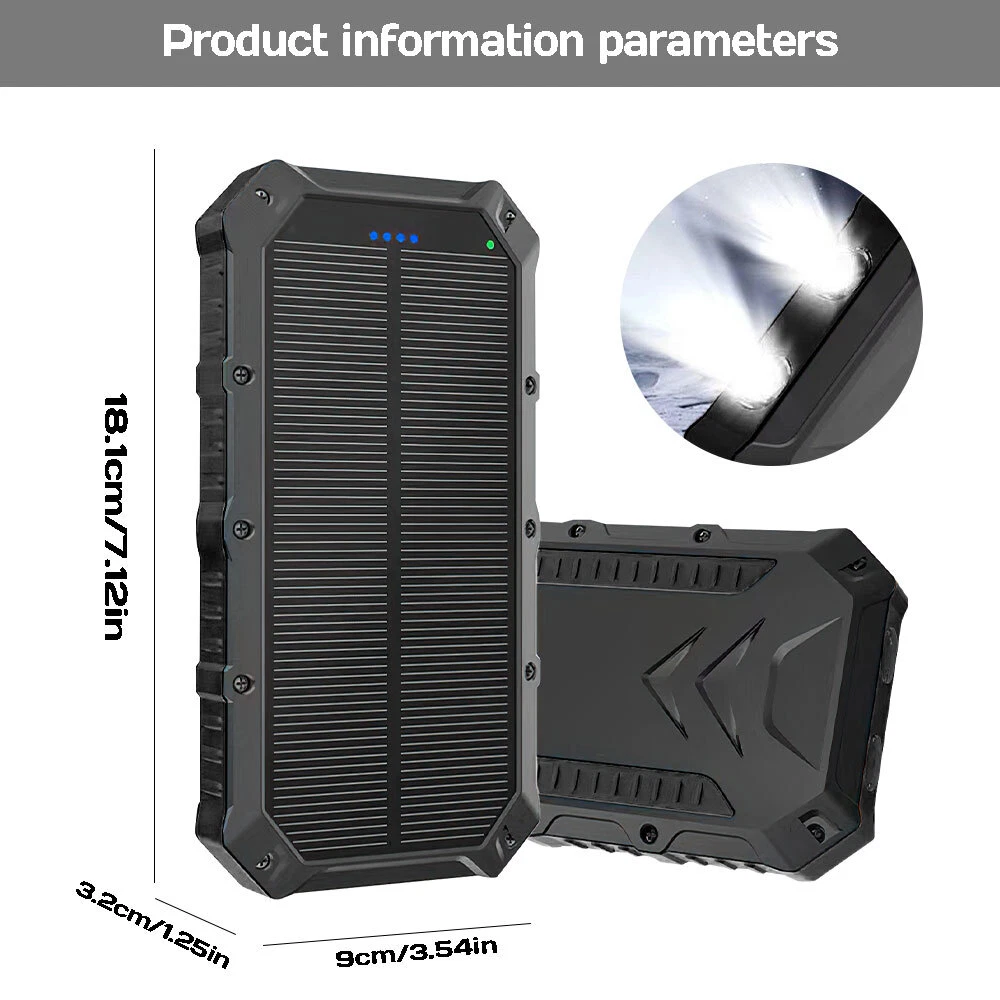 Features: [ S uper capacity ] : The solar charger has a large battery capacity of 900000mAh, and this solar charging treasure can charge your device many times. Super battery life allows you to get rid of the anxiety and worry about the exhaustion of equipment power anytime and anywhere. [ Power supply for three devices at a time ] : This solar cell phone charger is also equipped with four ports (Micro USB input, USB A&B output, USB C input/output), which provides 5V/3A high-speed charging to save time. It supports charging three devices at the same time. It can support QC3.0 fast charging protocol. Keep all devices active. Sharing with family and friends is perfect. [ Two different charging methods ] : The 900000mAh external battery charger can be charged through the adapter and solar energy, so as to avoid the trouble of power failure. It is strongly recommended to charge through the wall socket in daily life, and use the solar charging function as an emergency backup solution. The USB cable in the package is only used to charge the solar charger. Charging other devices is not recommended, because incompatibility may reduce the charging efficiency. [ Rugged outdoor design ] : The charging treasure is made of sturdy professional ABS materials. This solar battery pack (IP65) is waterproof/shockproof/dustproof and can withstand harsh outdoor environment. It is equipped with double super bright LED lights, which is an essential tool for outdoor activities and family emergencies. The charging life is over 1600+ times, which is very reliable and durable. Parameters: Shell material: PVC Color: Black Battery type: Lithium Polymer Battery Battery capacity: 900000mAh Function: Support 15w Fast Charge Package Contains: 1 x Solar Power Bank 1 x Charging Cable