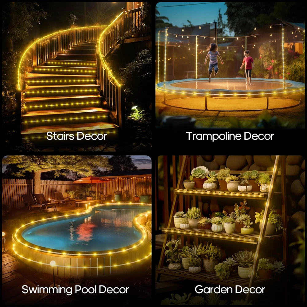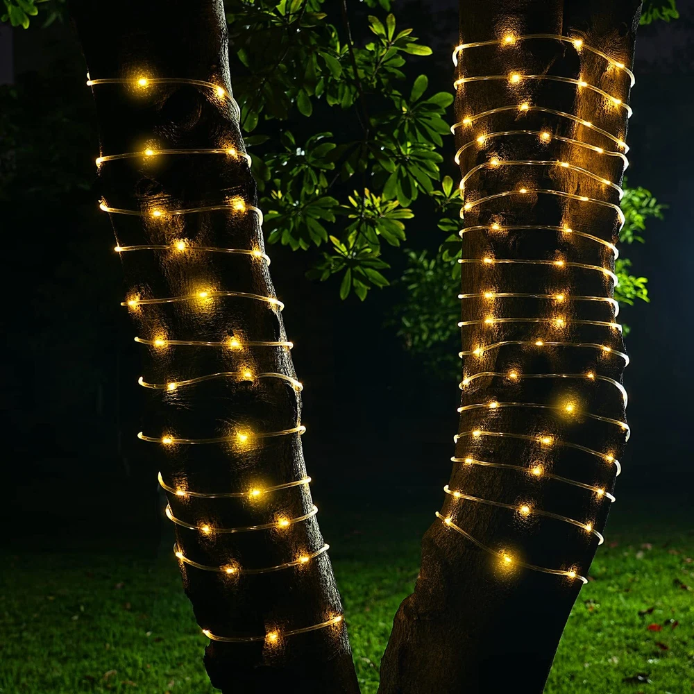Upgrade Solar String Lights - Total 72ft / 200 led Outdoor string lights with 17 keys remote. it provide 8 light modes (1-7 are different flash modes, mode 8 is steady on), Adjust the brightness; Timer function. Total 72ft: 66ft string lights + 6.6ft traction line Energy Saving & Environmental Protection- High-quality solar power, effective energy saving. It built-in 1200mah rechargeable battery, solar panel charging during the day, light auto turns on at dusk, 20h runtime when fully charged. Tips: Please do not remove the protective film on the solar panel to avoid shortening the life of the solar panel. Memory Function & Timing Function: This solar light has memory function, you just need set time, they stay set until you adjust them again. Timer function - 3H/5H/8H. Longer Life & More Safe - Our solar light is completely covered by a transparent PVC tube, it is durable and flexible, you could DIY the solar lights into any shape you want. It's also much safer for and pets compared with ordinary copper wire string lights Christmas Decoration & IP67 Waterproof - This rope light is IP67 waterproof, you could use this it in sun/ wind /rain/snow/ fog and any weather. It's a good choice for Indoor & outdoor decorations, and fit special events like party, Xmas, Halloween, Thanksgiving, wedding, birthday, Valentine’s day, etc Package: 1* string light, 1* solar panel, 1* remote control, 1* user manual, 10* zip ties. Any questions please us.