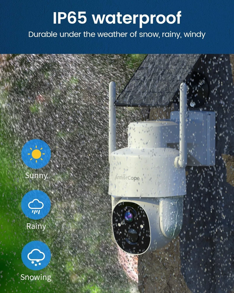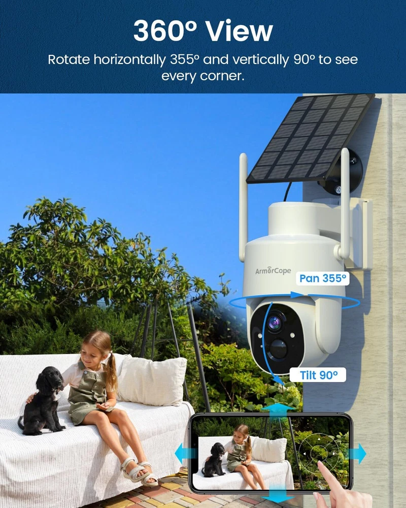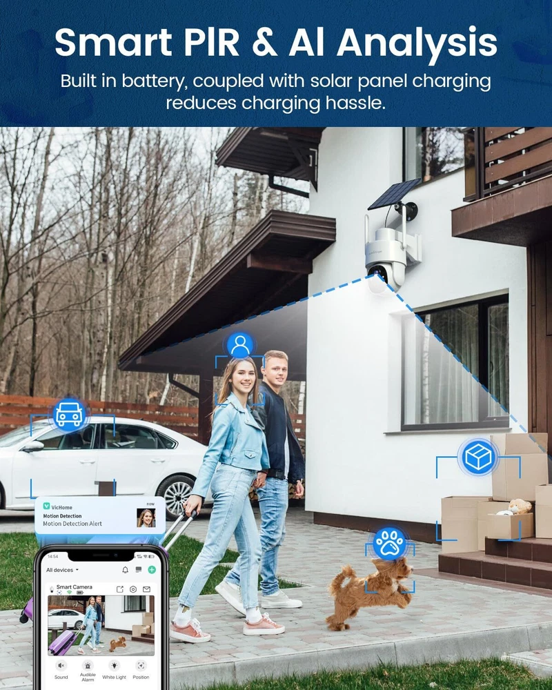 【Solar Powered & 100% Wireless Easy Installation】Work with Vicohome App.The solar powered outdoor camera eliminates the need for wires and cables, making it easy to install and use. This wireless rechargeable battery camera can operate continuously as long as there is sunlight to provide the necessary electric power. 【360° PTZ View & IP65 Waterproof 】This PTZ outdoor security camera has a 355° horizontal and 100° vertical rotation range, allowing it to capture wider areas and record crystal-clear videos. IP65 waterproof rating and ability to operate in temperatures ranging from -4°F to 131°F, make it ideal for use in various weather conditions, ensuring the safety of your home at all times. 【2K High-Definition with Color Night Vision】wireless security camera with 2K Full HD resolution for superior day and night vision. Advanced color night vision technology allows you to enjoy vivid and accurate colors even in low-light conditions. 【PIR Motion Detection & 2-Way Audio】Surveillance camera adopted PIR sensors with flexible motion sensitivity to avoid false alarms caused by insects. You will receive a notification on your phone once any movement of human is detected. Built-in microphones and speakers allow you to communicate with people in front of the camera no matter where you are. 【Easy Setup & SD/Cloud Storage】With reliable and stable 2.4Ghz WiFi connection (5G is not supported), you can effortlessly enjoy uninterrupted video streaming and remote access to your camera from anywhere at any time.You can choose to store event recordings on an SD card (up to 128G, SD card not included) or in cloud storage (Free cloud for 3 days videos),always safe and easily accessible.