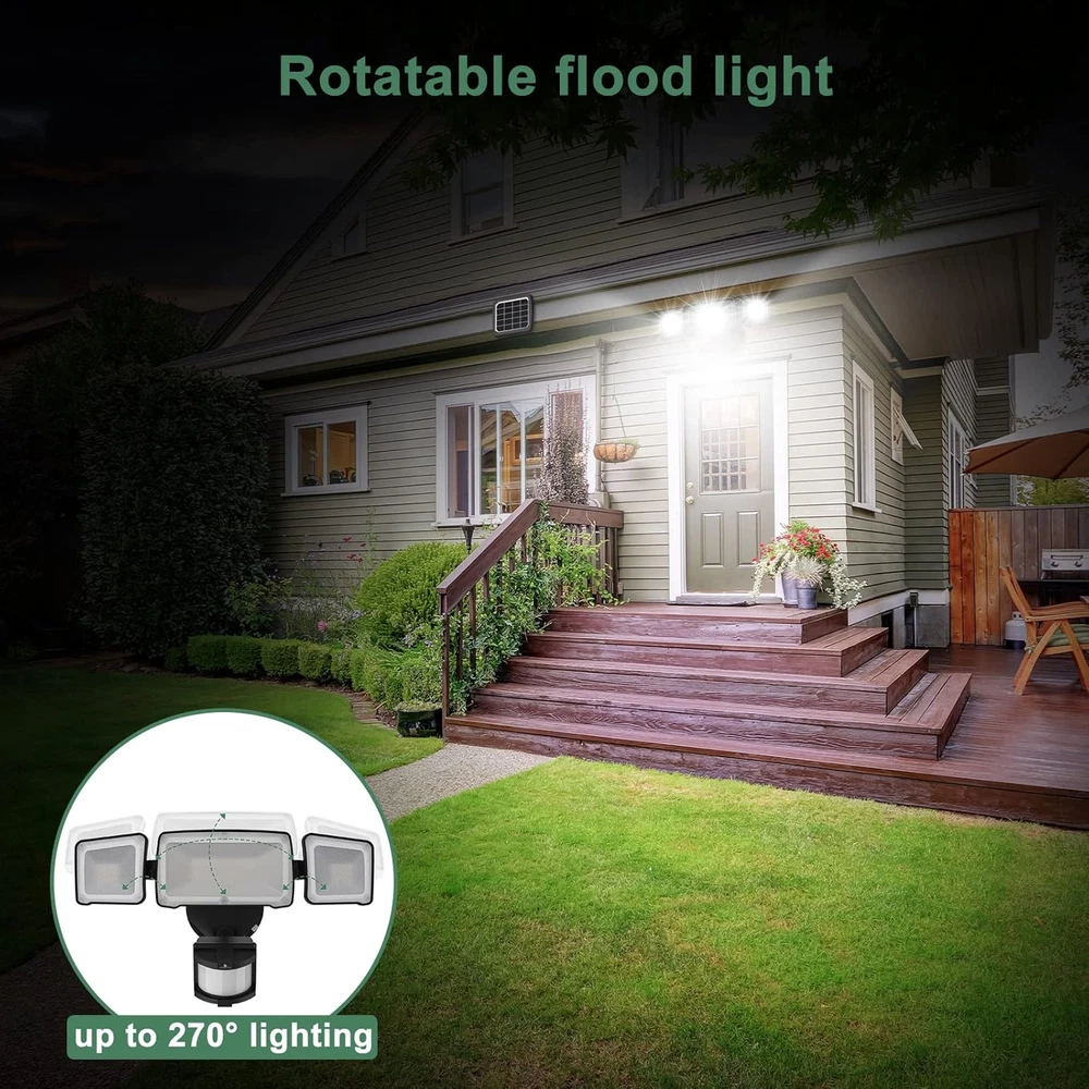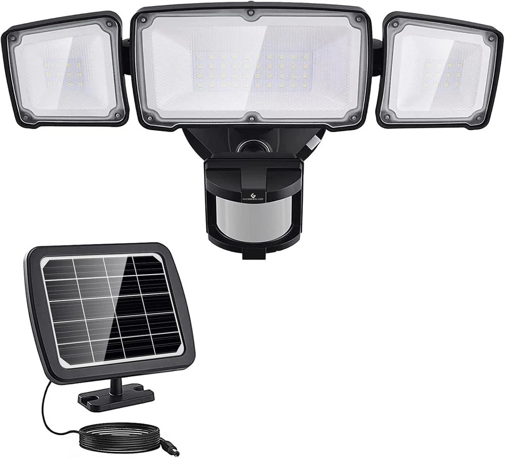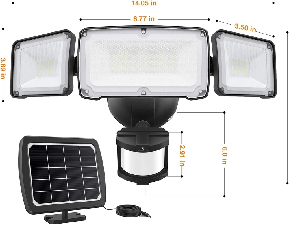 Solar Powered & Energy Saving: Our solar powered outdoor lights are built in solar-powered 2400mAh battery, no extra electric cost and environment friendly. After fully charged, the solar outdoor lights can stay on for 50 mins with 1600 lumen brightness. Motion Sensor Outdoor Lights: The solar motion lights outdoor can accurately sense moving people, animals, cars at a 180° wide motion detection angle. Just an easy turn of stepless adjustable switch, you can customize sensing distance 0-72feet and lighting time 0-120s. IP65 Waterproof Outdoor Solar Lights: IP65 waterproof rating ensures the outdoor flood light can withstand rain, sleet and snow, a great outdoor flood light for your house. Perdurable Material & Professional Design: The outdoor solar flood lights are powered by LED beads and supported by professional optical designed filter lenses. 3-head and motion sensor adjustable, ideal for garage, porch and yard lighting etc. Easy Installation: The outdoor solar motion security light can be easily mounted on a wall through simple steps in the manual. Wall, eave and soffit mounting are supported. When mounted under eave/soffit, please make sure the motion sensor faces toward the detection area. Note: Please make sure the solar panel is under sufficient sunlight. Product Description Solar Powered Security Light GLORIOUS-LITE store pursues good quality and energy saving lights for customers, and we will keep our promise all the time. Featured with solar powered and long lifespan, this solar motion sensor light no extra electric cost . Wonderful security light fixture for indoors and outdoors. Three Modes of Solar Motion Sensor Outdoor Light Test Mode When you receive the solar security light, you can use this mode to check if it works, whatever day or night. Motion Sensor Mode When the security light senses movement at night, it will automatically light up. Constant on Mode After the solar panel is fully charged, the solar motion light can stay on for 50 minutes in continuous light mode DIY the sensitivity and lighting time by yourself Stepless adjustable sensing distance According to your need, you can adjust the sensing range of security lights from 10ft to 72ft steplessly. Stepless adjustable lighting time You can adjust the lighting time upon motion detection of motion sensor lights within 120s steplessly. Widely used Light up your doorway The security light is ideal to install on the eaves, when your family play at the door at night, they will get a brighter environment Widely used Light up your garage The security light is perfect for installation at the garage door. When you drive home, the solar flood light will automatically illuminate your route. Widely used Light up your yard Solar motion light is great for yard installation. When you want to relax in the courtyard with your family, security light will provide the right lighting. Fix the board Take out the plug board behind the security light, and fix it to the wall with screws Buckle the light Buckle the light into the mounting plate securely Fix the solar panel Fasten the solar panel to a sunny place near the motion light Connect the wire Connect the solar panel to the motion light with the included wire How To Install Solar Security Light 1 STEP 1 2 STEP 2 3 STEP 3 4 STEP 4 Various Security Lights Type Add to Cart Add to Cart Add to Cart Customer Reviews 4.5 out of 5 stars 7,580 4.5 out of 5 stars 7,580 4.5 out of 5 stars 7,580 4.5 out of 5 stars 3,072 4.5 out of 5 stars 3,072 4.5 out of 5 stars 3,072 4.4 out of 5 stars 831 Price $48.99 $ 48 . 99 $48.99 $ 48 . 99 — — — $45.99 $ 45 . 99 — Energy Source Solar Powered Solar Powered Solar Powered Hard-wired AC Powered Hard-wired AC Powered Hard-wired AC Powered Solar Powered Brightness 1600LM 1600LM 1600LM 3500LM 3500LM 3500LM 1000LM Lighting time after sensing Adjustable within 2min Adjustable within 2min Adjustable within 2min Adjustable within 10min Adjustable within 10min Adjustable within 10min Adjustable within 2min Sensing Distance 0-72feet Max 0-72feet Max 0-72feet Max 0-72feet Max 0-72feet Max 0-72feet Max 0-72feet Max Waterproof Rating IP65 IP65 IP65 IP65 IP65 IP65 IP65 Wattage / / / 35W 35W 35W / Specifications Power source Solar powered Solar panel material Monocrystalline silicon, more efficient Brightness 1600LM Color Temperature 5500-6000K Wire Length 15feet Lifespan 50000+Hours Sensing Distance 0-72feet(stepless adjustable) Lighting Time 0-120s(stepless adjustable) Sensing Range of Motion Sensor 180° Package Included 1 x GLORIOUS-LITE Solar LED Security Light, 1 x 15feet cable, 1 x Solar Panel, 1 x Bag of accessories , 1 x User manual