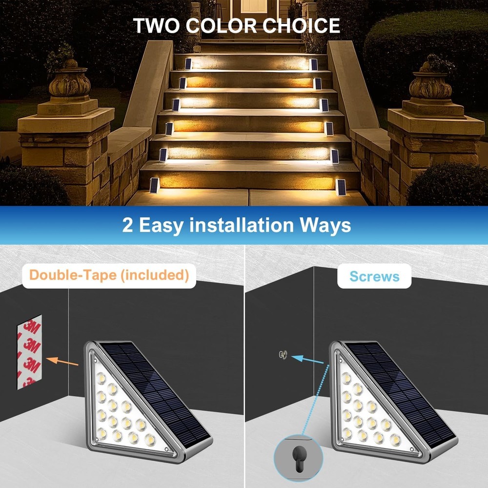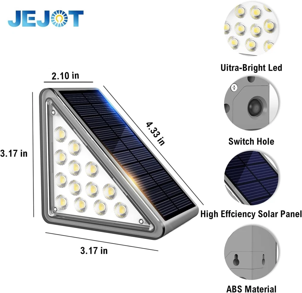 Solar Step Lights Outdoor Stair Lights, Deck 4.34*3.25*2.19in, Gray Product Details Brand: JEJOT Color: Gray Material: Acrylonitrile Butadiene Styrene Style: Modern Light fixture form: Step Light Room Type: Porch Product Dimensions: 2.19"L x 3.25"W x 3.25"H Specific Uses For Product: Garden, Yard, Pathway, Deck, Walkway Indoor/Outdoor Usage: Outdoor Power Source: Solar Powered Special Feature: Energy Efficient, Adjustable Color Temperature, Dimmable, Waterproof, Color Changing Light Source Type: LED Shade Material: Plastic Theme: Love Light Color: White, Warm Included Components: Mounting Hardware Lighting Method: Adjustable Specification Met: CE, RoHS Number of Items: 8 Bulb Base: E26 Switch Type: Dimmer Water Resistance Level: Waterproof Assembly Required: No Manufacturer: JEJOT Size: 4.34*3.25*2.19in Model Name: JEJOT-8p Part Number: J-117 Item Weight: 2.51 pounds Country of Origin: China Item model number: j117 Special Features: Energy Efficient, Adjustable Color Temperature, Dimmable, Waterproof, Color Changing Batteries Included?: No Batteries Required?: Yes Color Temperature: 3000 Kelvin Product Dimensions : 2.19 x 3.25 x 3.25 inches; 2.51 Pounds Item model number : j117 Manufacturer : JEJOT Country of Origin : China Brand: JEJOT Color: Gray Material: Acrylonitrile Butadiene Styrene Style: Modern Light fixture form: Step Light Advanced and Practical:JEJOT Solar step lights for outside can create a bright beam of light on each step,Combining charming appearance and lighting, you can enjoy the pleasant feeling brought by solar staircase lights,Make your garden, courtyard, and stairs more beautiful Two modes and Monocrystalline silicon solar panel:Outdoor stair lights have two modes to choose from: warm (3000k)/white (6500k) to adapt to different seasonal scenes,Monocrystalline silicon solar panels can absorb and release long-term light in a small amount of time, allowing outdoor staircase lights to achieve high conversion Waterproof and Durable ABS material:The outdoor solar steps lamp adopts IP65 waterproof technology, which can resist various outdoor weather conditions and meet daily needs. The lamp body is made of ABS material, greatly improving the service life of the solar staircase lamp Two Installation methods:solar lights for steps are perfectly decored on garden stairs, patio, yard, deck, porch step and sidewalk,etc. The triangle solar outdoor lights go in the corners so they are not in the way. No worry about stepping and tripping. 2 installation ways: 1)Directly attached to the stairs by 3-M sticky tape. 2)Fix the outdoor accessories on the stair by screws and bolts. (Tips: Solar stair lights need to be installed in a sunny spot.)