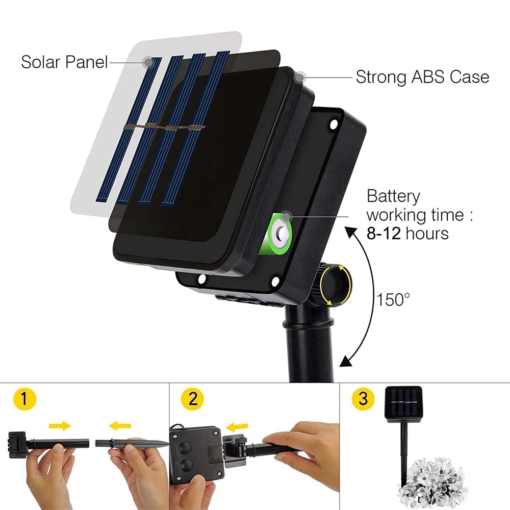 Upgraded Solar Flower String Lights: Using larger solar panels (3inch×3inch) and higher 1200mAh rechargeable batteries, higher energy conversion rate, providing excellent lighting performance. It can work continuously for 10-12 hours after charging, the battery can be replaced. 100 super bright LED lights, 40 feet of cable, long enough to fit any indoor and outdoor space. Provide ideal decoration for your garden, porch, lawn, courtyard, gate, courtyard, wedding, banquet, etc. Up to 8 Lighting Modes: Our solar string lights have total of 8 different working modes-combination, waveform, sequence, slow light, chase/flash, slow fading, blink/flash, steady brightness, can create romance and softness in any occasion , Warm atmosphere, especially on festive occasions. Energy-saving and Automatic switch: Solar charging, no electricity bills, battery life up to more than 18 months. These solar lights charge during the day, turn on automatically at dusk, and turn off at dawn. Widely used Holiday Lights : 100 transparent flowers (1.2 inch in diameter) and 40 feet long, decorate your garden or outdoor space trees, or use this solar string light to replace traditional plug-in lights. Perfect for many occasions like Christmas, New Year, Ramadan, Halloween, Birthday Party, Valentine's Day. Waterproof and After-sales service: String lights and solar panels are all waterproof, and can be used indoors and outdoors, without worrying about weather damage. We always provide worry-free after-sales service. If you have any questions about the product, please don't hesitate to contact us, we will reply within 12 hours.