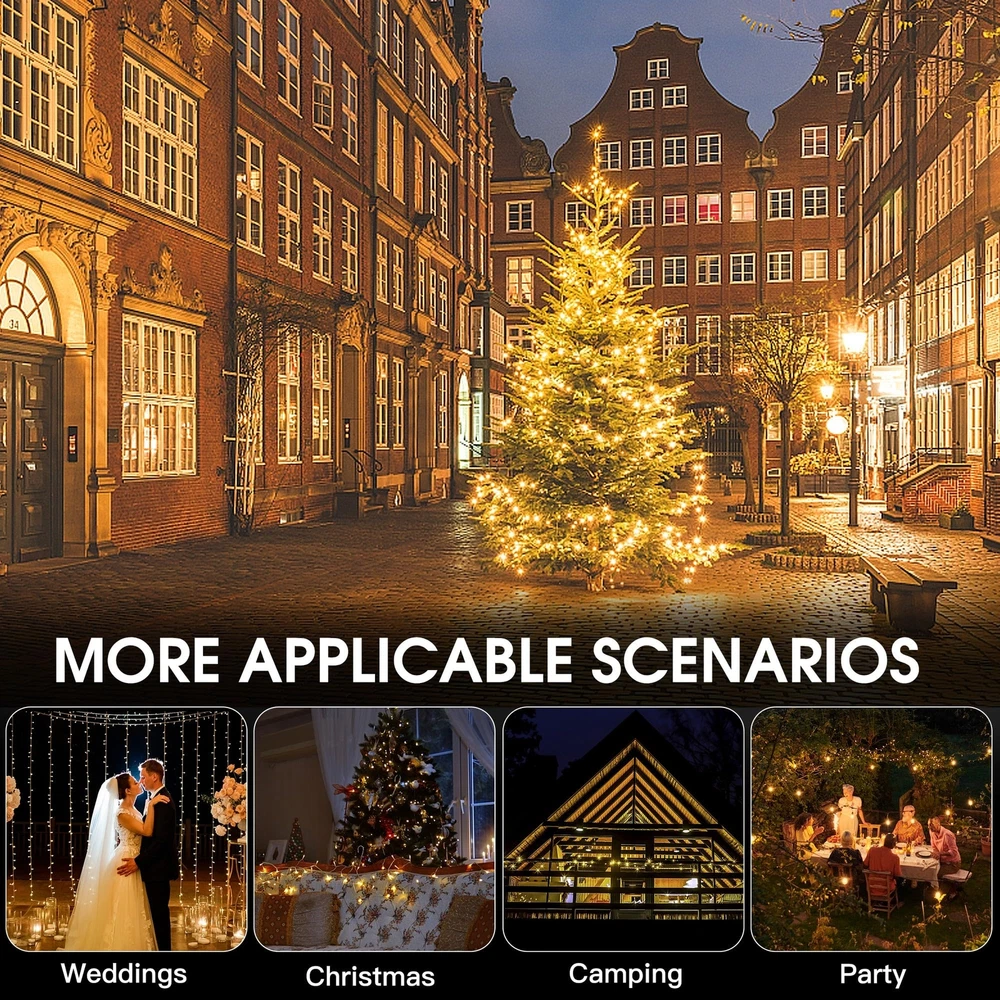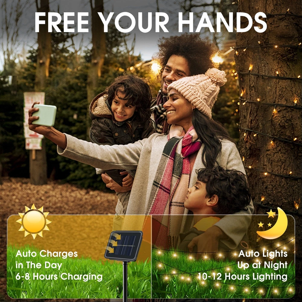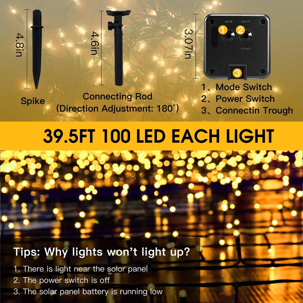 solar outdoor waterproof powered led panel led tree outside fairy twinkle mini yard ambience panel 8 mode decorative patio party yard garden decorations hanging bright weatherproof 💡NEW UPGRADED SUPER BRIGHT SOLAR LIGHTS: This solar outdoor string lights use the upgraded LED bulbs and solar panel, with stronger brightness and higher solar energy conversion. With the mode button, you can select 8 lighting modes to meet your different needs. 💡MEMORY FUNCTION & AUTO ON /OFF: The solar Christmas lights with memory function can save your last setting, so you don't need to reset it. The solar panel adopts photosensitive technology, which can be automatically turned on during the day and turned off at night, freeing your hands. 💡ENERGY SAVING AND EFFICIENT: This outdoor string lights solar powered(2 packs,each 100LED 33FT )have no extra utility electrical power requirement. After being fully charged in 8-10 hours, it can work for 10-12 hours, which can be used all night. 💡IP65 WATERPROOF:The chip of the solar twinkle lights is encapsulated with epoxy resin, which can withstand the temperature from -85℉ to 122℉, with good heat resistance and service life. It can easily cope with bad weather such as heavy snow and heavy rain. 💡WIDE RANGE OF DECORATION:This solar patio lights can decorate a porch, roof, tree, front yard, umbrella, fence, pergola, bistro, restaurant, hotel, commercial building, etc. It is also a great choice for Christmas, New Year, and party decorations.