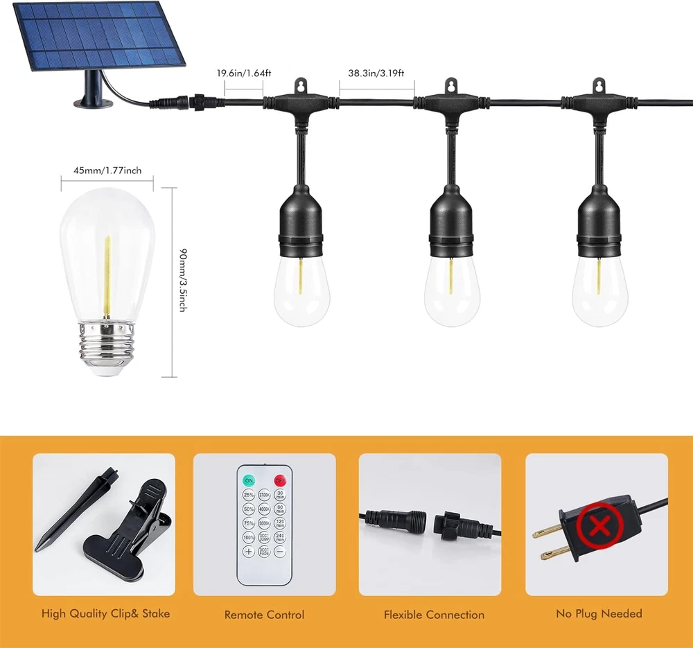 Store New Arrivals Add to Favorite View Feedback Contact Solar String Lights Remote Control,35Ft Dimmable Solar String Lights Outdoor, 10 Shatterproof Solar Patio Lights, Ambience on Your Garden Backyard Description Item model number 35FT Light Source Type LED Style Modern Power Source Solar Powered Number of Light Sources 10 Control Method Remote Theme Space Style Number 35FT Controller Type Remote Control Occasion Type Christmas Additional Features Solar Powered, Dimmable, Shatterproof Package Dimensions 10.35 x 6.26 x 6.1 inches; 3.15 Pounds Indoor/Outdoor Usage Outdoor Material Type Plug Light Color White Water Resistance Level Waterproof Occasion Christmas Special Feature Solar Powered, Dimmable, Shatterproof Bulb Shape Size ED28 Color Temperature 2.7E+3 Kelvin Color White (2700K, 4000K, 5000K) Indoor Outdoor Usage Outdoor Voltage 1.2E+2 Volts Included Components remote control, spare bulbs Style Name Modern Size S14 35 FT 【Upgraded 3 colors string lights with FADE JUMP function】 This is an awesome string lights you’ve never met!! Built by the latest LED technology, 2700K 4000K 5000K color lights are all in one string- From warm white to daylight white for choosing, our LED patio string lights can be customized for any arrangements like birthday party, family/friends reunion or wedding reception. 【Fully dimming by included remotes】 No need to buy extra dimmer anymore!! These LED bistro string lights can be dimmed by included remote controller from 25%-100%, you can pick up the suitable brightness for all your occasions. Also there’s always a back-up for you as we equip each string lights with 2pcs remote controllers, never worried for the remote missing 【Commercial-grade & waterproof IP65】 Made of Industrial grade casing, thicker flexible cord and Shatterproof plastic bulbs, our string lights are designed to withstand the wear and tear of year-round outdoor use; Layers of insulation enhance the strand to withstand extreme temperatures, rainy, windy, or damp climates, perfect for long-time indoor/outdoor use 【Easy installation for any occasions】 Use cup hooks, guide wires, or zip ties with the built-in loops to hang the outdoor lights perfectly, enlighten any event or create a festive flair within minutes. Each strand contains 15 hanging E26 base S14 bulbs spaced 3 feet apart. Link up to 3 strands max. The patio lights are still cool after long period of use with 24V safe low voltage 【Your satisfaction is our priority】 Package contains 15+3pcs LED Bulbs, 1 pack 48ft stands, 2pcs remote controllers and user manual. We proudly stand behind all of our products 100% with confidence and offer a full 12-Month warranty. If you are not fully satisfied for any reason, please email us; we are committed to making it right for you in 24hrs. Product Description Why choose Auroraworld Outdoor String Lights? Auroraworld Outdoor String Light is an ideal light for adding comfortable atmosphere, give an inviting warm glow that will bring any room or party to life. Perfect for any event or everyday use, illuminate your backyard, patio, gazebo, or use as a festoon to celebrate your wedding, anniversary, or graduation in style. Impress your bistro, cafe, or party guests with ambiance. End-to-end Connection Each strand has end to end connector, and you can easily connect up to 60 strands, which is long enough for all kinds of activities. Shatterproof Plastic bulbs of string lights enable sustainable, durable, and long-lasting design, no worry from glass shards, especially for outdoor use Waterproof IP65 waterproof, outside string lights can withstand extreme temperatures, rain, and windy or humid climates, which is durable for long-term use. It is the best choice for outdoor lighting or decoration. ABOUT US We offer the best prices around on high quality products. Our E-store includes media such as books, movies, music and games while offering electronics, toys, sporting apparel, clothing, tools, general home, garden items and more. SHIPPING We are always working hard to ensure your package arrives as soon as possible. Please understand that some factors like weather, high postal traffic, and the performance of shipping companies are outside of our control. We offer free shipping to the lower 48 states and ship within 2 business days of payment, usually sooner. We do not accept P.O. Boxes. Please provide a physical address. For shipping outside of the continental USA, we only use eBay's Global Shipping Program.The item is shipped to KY and then sent to the rest of the world. International customers are responsible for all duties and taxes. Continue to check out in order to calculate costs for shipping the item to your country. Messages regarding eBay's Global Shipping Program MUST be directed at eBay EXCLUSIVELY. RETURNS We offer a 30-Day Return Policy on items which you are not completely satisfied with. You have the option for a full-refund or an exchange of the item. No returns are available on items shipped outside of the USA. PAYMENT We accept PayPal. CONTACT US This page content is yet to come Please ad us to your favorite seller and visit again later Thank You CUSTOMER SATISFACTION We try our very best to make sure every customer is completely satisfied. If there's a problem, message us! We're happy to help. WE ACCEPT Copyright © 2021 AutoDS. | All Rights Reserved
