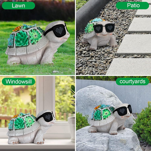 Solar Garden Statues Turtle with Succulent and LED Lights Birthday Gifts for Women Mom Grandma Solar Outdoor Decor for Patio Backyard Yard Lawn Decoration-Unique Housewarming Gifts LuxeFusion Product Description Introducing our exquisite Solar Garden Statues, the perfect addition to your outdoor space. Crafted with high-quality materials, these statues feature a charming turtle design adorned with succulent plants and LED lights. Symbolizing resilience and happiness, these statues are not only visually appealing but also weather-resistant. The eco-friendly battery is powered by solar energy, offering convenient and automatic lighting at customers love these large-size, durable solar garden statues for their thoughtful design and practicality. Whether as a decorative piece for your garden or a meaningful gift for a loved one, these statues are sure to bring joy and beauty to any outdoor setting. Enhance your garden decor with these stunning turtle garden statues that provide both aesthetic appeal and eco-friendly't miss out on this opportunity to elevate your outdoor space with our Solar Garden Statues. Experience the magic of these charming statues that combine artistry, sustainability, and convenience. Purchase now and enjoy the beauty of these solar-powered statues while contributing to a greener environment. Upgrade your garden decor with these exquisite solar garden statues today! Features 【Creative Lighting】The sunglasses on our turtle statue rotate the LED lights ‘i’, ‘❤︎’ and ‘U’, which is very creative, cool and cute and can add to your garden decor. A perfect addition to your outdoor space, this weatherproof statue exudes resilience and joy while lighting up your garden with eco-friendly solar power 【Finely Crafted】Our large-size Turtle Garden Statue is meticulously crafted to stand the test of time, embodying both style and durability. With succulent plants delicately integrated into the design, this statue captures the essence of nature, making it a unique and enchanting piece for any garden landscape 【Eco-friendly】Elevate your outdoor ambiance with the seamless integration of modern technology and nature-inspired aesthetics. This Turtle Garden Statue boasts an eco-friendly battery powered by solar energy, ensuring long-lasting illumination throughout the night while requiring minimal maintenance 【Solar Charge】Say goodbye to cumbersome wiring and batteries, as this Solar Garden Statue offers effortless solar charging and automatic lighting functionality. Simply place it in direct sunlight during the day, and watch it come to life at night, creating a captivating display that will enchant and delight both you and your guests 【Idea Gifts】Unleash the magic of our Solar Garden Statue as a thoughtful gift option for loved ones. Each purchase comes with excellent customer service, ensuring a seamless shopping experience from start to finish. Embrace the beauty of outdoor solar decor with this enchanting turtle garden statue that combines artistry, functionality, and eco-conscious design Product Details Color: Gray Brand: Pawatee Theme: Decor Material: Resin Style: Turtle Occasion: Womens Day, Mother's Day, Christmas, Birthday, Thanksgiving Product Dimensions: 7.48"D x 4.92"W x 4.72"H Recommended Uses For Product: Outdoor Mounting Type: Freestanding Included Components: Light kit inlcuded Item Weight: 1.4 Pounds Number of Items: 1 Item Weight: 1.4 pounds Manufacturer: Pawatee Country of Origin: China Item model number: 10011 🚚 Free Shipping All orders ship free and fast to your doorstep. 🔁 Easy Returns Satisfaction guaranteed. 30-day returns, no questions asked. 💬 24/7 Support Contact us anytime; we’re here to help, day or night. Brought to you by LuxeFusion – Quality you can trust.