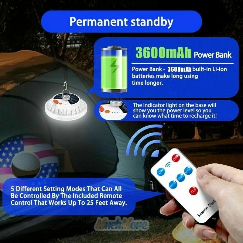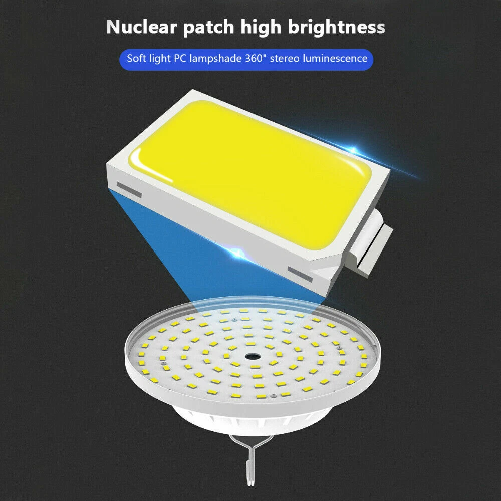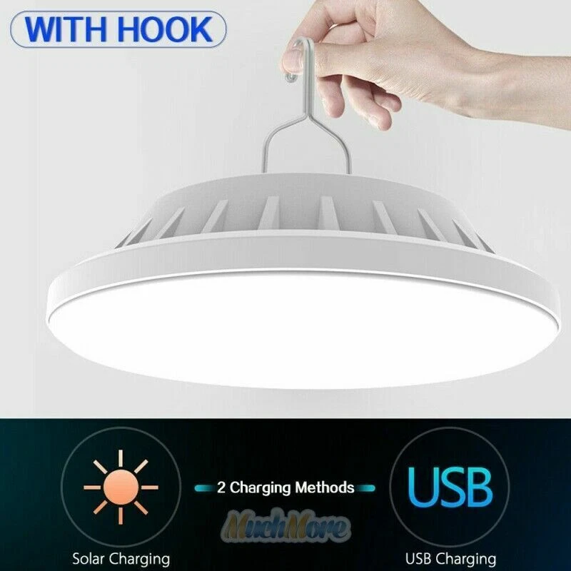 Solar USB LED Rechargeable Camping Lantern Light Emergency Lamp Remote Control ***USA Seller - Quick Postage - Same Day Dispatch *** Fast Free Delivery If You Have Any Issue Contact Us Description: Ultra-high brightness: Equipped with 120 crazy high-brightness LEDs, uniform lighting and large lighting area. High light transmittance PC lampshade, soft and comfortable light. Easily illuminate the entire room, very suitable for camping, hiking, fishing, repairs, emergency use when power outages. Two charging modes: built-in 3 lithium batteries (3600mAH) and a new monocrystalline silicon solar photovoltaic panel, which can be charged by USB cable or solar energy. With battery indicator, you can control battery usage in real time. It can also be used as an emergency power bank to charge mobile phones, tablets, earphones and other devices through the USB output interface. Long lasting life: using 3 batteries as a power source and charging via USB within 6 hours, it can provide an amazing luminous flux of 2000 lumens for 6-48 hours, and its service life is longer than most LED lights on the market. 5 lighting modes and dimmable: Just press the switch of the solar chandelier to adjust the brightness. Choose high light, medium light, low light, fast strobe or low frequency flash to meet your requirements With foldable hook & a wide range of uses: IPX4 waterproof solar light, sturdy and durable, long service life. Using the hook, you can carry it with you and hang it anywhere. It is very suitable for any outdoor activities, such as backpacking, hiking, camping, fishing, yard dinner, etc. Features: Type: Solar Emergency Light Material: PVC Color: White Input voltage: 3.7-4.2 (V) Protection Class: IP65 Battery capacity:3600mAh Diameter:160mm/6.29inch Height:45mm/1.77inch Lighting time: 6-48 hours Lighting gear: Strong light-Medium light-Low light-Strobe-SOS Power display: Smart four-gear electric display Switch control: traditional switch + remote control Power supply:USB charging+Solar charging Package Includes: 1 x Solar Emergency Light 1 x Remote Control 1 x USB Cable