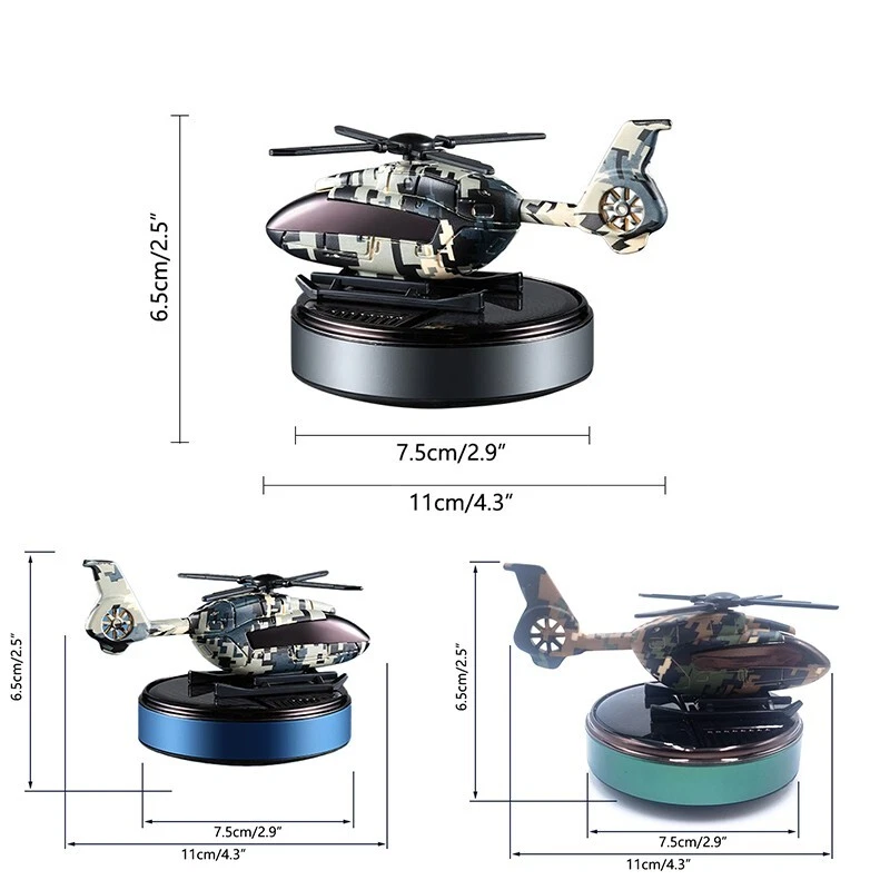 Solar car freshener, helicopter model, solid aromatherapy car air purifier [Compact size and high quality materials] : Camo Solar Aircraft in-vehicle Aroma: 11 x 7.5 x 6.5 cm /4.3 x 2.9 x 2.5 inches. The helicopter fuselage and metal rings are made of high-quality ABS+ aviation aluminum alloy. [Solar power supply] : Solar collector consists of solar panels, high efficiency. This camo solar Airplane in-car aromatherapy can spin itself anywhere in the sunny outdoors without the need for batteries and cables, so you can make it an excellent home ornament or unique car ornament [Safe ] : Essential oils are extracted directly from plants, 100% natural, evaporating without any pollution. Not harmful to children and pregnant women [Perfect Christmas gift] : The car aroma purifier is not only a car air freshener, but also an excellent decoration for the can or home, which is the perfect gift for family and friends 【 Available in three scents 】 : Camouflage blue [sea flavor] Top note: Bergamot, black tea shade, Gepong Middle note: broken lotus leaf, cardamom, clove after note: cypress wood, rock grass orchid, sandalwood Camouflage Green [Antique] Top note: Bitter orange flower oil, citrus Medium: Bergamot oil, neroli, rosemary Afternote: sweet orange oil, lavender Camouflage Black [Gardenia] Top note: Lavender, Gardenia, Gabon Medium note: Broken lotus leaves, cardamom, cloves After notes: Sweet orange, lemon, sandalwood