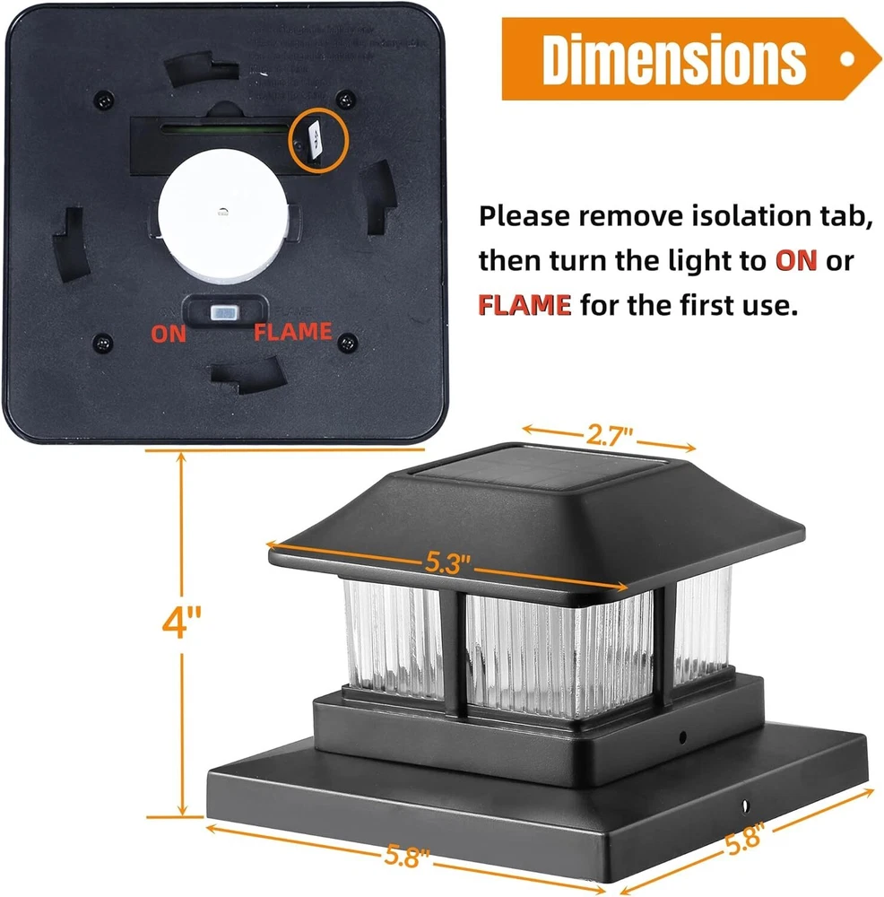 Dynaming Solar Flame Post Cap Lights Outdoor, Solar Powered Fence Post Light,... PLASTIC SOLAR POST LIGHTS: 6 pack modern post cap lights powered by solar, each with 12 pcs yellow SMD LED, they are the perfect decorative outdoor lighting and no electricity required. Solar LED flickering flameless candles lights, add a 360 degree viewing angle illuminate charming to your garden, decorate your fence, deck, porch or yard. Measurement: 5.8 x 5.8 x 4 inches DANCING FLAMES LIGHTS: A safe alternative to the real flame effect - 12 pcs high brightness SMD LEDs cast a safe, soft and gentle glow, produces a very calm and impressive atmosphere. When night comes, it lights up and the LED flame light leaping, which will bring you a beautiful scenery. There are 2 LIGHTING MODE - FLAME and ON, if you want flame effect, please turn to FLAME. Please note that they are designed for outdoor decoration, maybe not bright enough, but the light is soft and gentle SOLAR POWERED: This beautiful solar light is NOT electricity needed. Powered by solar, charged in full and direct sunlight for 6-8 hours. There is a tab at the back of the solar panel, please remove it and turn to ON or FLAME before charging, so that this solar LED lights will automatically turn on at night and turn off at dawn. For your convenience, each include 1000MAH NI-MH AA rechargeable battery EASY TO ASSEMBLE: Complete with detailed instructions. Our fence post solar lights come with different sizes of bases, which are compatible with any standard true size 3.5"x3.5", 4"x4", 4.5"x4.5", 5"x5", 5.5"x5.5" wood / vinyl / plastic post cap. These solar garden lights can be done in a few minutes, comes with mounting kit, simply screw the solar cap lights into highest point on the railing OUTDOOR DECORATIVE LIGHTS: These 6 pack garden flickering flame post lights can work normally under kinds of weather with the waterproof rating of IP44, no worries about little rain, snow, frost, or sleet. They can be placed in the front, backyard, along driveway, walkway, sidewalk, around your patio or porch, adds a modern look for your outdoor lighting. In stormy weather, keep the solar lights indoors to avoid damaging the solar panels Shipping We offer FREE shipping on all orders! We ship within Three business days of payment, usually sooner. Local pickups and combined shipping options are not provided at this time. Return You can return a product for up to 30 days from the date you purchased it. Any product you return must be in the same condition you received it and in the original packaging. Please keep the receipt. Payment We accept payment by any of the following methods: PayPal Please pay as soon as possible after winning an auction, as that will allow us to post your item to you sooner! Feedback Customer satisfaction is very important to us. If you have any problem with your order, please contact us and we will do our best to make you satisfied. Contact Us If you have any queries, please contact us via ebay. We usually respond within 24 hours on weekdays. Please visit our eBay store to check out other items for sale! Thank you for shopping at our store.