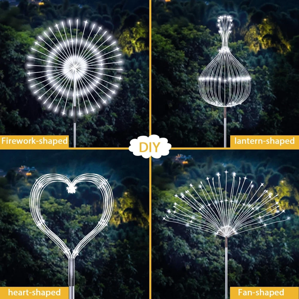 【Creative Solar Garden Lights】This 2-pack set of Solar LED Firework Lights features 120 LED lights distributed across 40 branches of flexible copper wire. With two lighting modes—twinkling and steady on—these lights can be shaped into various designs, allowing you to customize your outdoor decor to your liking. Perfect for illuminating pathways, gardens, patios, and yards, these lights add a festive touch to any outdoor space. 【Waterproof Solar Outdoor Lights】Designed for durability, these solar lights are equipped with upgraded solar panels that ensure a long-lasting performance of 8-10 hours after a full day of charging. With an IP65 waterproof rating, they are built to withstand various weather conditions, making them ideal for year-round outdoor use. Product Description Perfect Decoration Automatic light sensor function allows the lights to turn on at night without manual intervention. Bright LED design enhances color vibrancy and brilliance, creating a captivating atmosphere. Flexible wire allows for easy shaping into desired forms, such as fireworks or flowers. Fireworks Solar Lights Outdoor Specifications Working Mode: ON / OFF / Twinkling Working Time: 8-10 hours of lighting after 6-8 hours of full sunlight charging Material: copper wire, stainless steel, and plastic Ideal for decorating gardens, backyards, sidewalks, flower beds, fences, and roofs NOTE: Ensure the switch is set to "ON" for optimal charging and performance. Regularly clean the solar panel to maximize sunlight absorption for efficient charging. Upgraded Solar Panel - Efficiently absorbs sunlight for optimal performance - Provides illumination for 8-12 hours when fully charged Waterproof IP65 rated to withstand adverse weather conditions DIY Any Shape Create your favorite shapes such as flowers, trees, fireworks, hearts, spirals, and spheres with ease. Solar Outdoor Garden Firework Lights - Add a Splash of Color to Your Garden