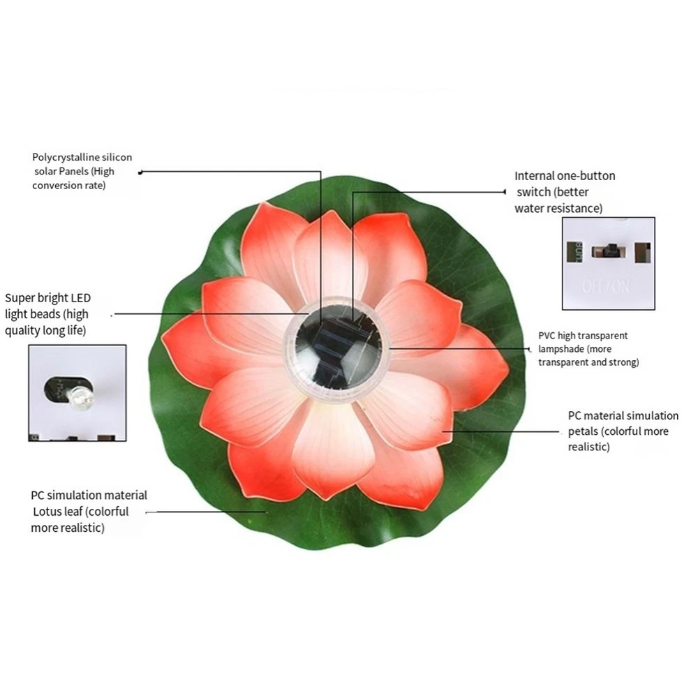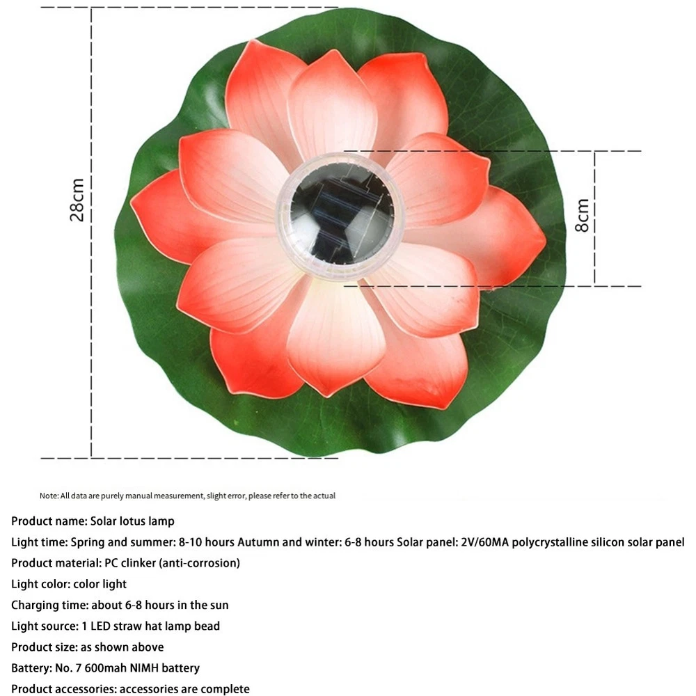Artificial Lotus Shape Solar Garden Light Vibrant Colors Automatic Illumination DESCRIPTION Features: * Vivid lotus appearance and 7 color lights: This solar-powered night light features a beautiful lotus shape with 7 color-changing lights, creating a vibrant and eye-catching display in your garden. * Automatically changing colors: The light automatically changes colors, adding a mesmerizing touch to your outdoor space. * Powered by solar energy: This lotus light is powered by solar energy, which charges during the day and automatically illuminates at night, saving energy and reducing emissions. * Intelligent light control function: With special optical fiber technology, the lights only activate in dark environments, providing a and enchanting glow during nighttime. * Floating and design: The lotus light floats on water like real lotus flowers and spins in the wind, adding elegance and vibrancy to your pond or garden. Specifications: *Product Name:Artificial Solar Lotus Shape Night Light Solar Powered Garden Decorative Pool Lamp Floating Fountain Pond Ornament Supplies *Material:PC *Size: 28cm/11inch *Color:As shown *Fitment: Pool ,Night *Number of Pieces:1 Package Content: 1*Lotus Pool Light Note: 1. The real color of the item may be slightly different from the pictures shown on website caused by many factors such as brightness of your monitor and light brightness. 2. Please allow slight manual measurement deviation for the data. POLICES Shipping Payment WARRANTY We only ship to confirmed ebay Order addresses. Please comfirm that your Order address is in line with your shipping address. Please kindly note that the c ombined shipping is not provided because the shipping fee is calculated by weight. Also, the each additional item means exactly the the same color and size. It takes about 7 -15 working days to US; about 10-30 working days to other countries. Transit time may be a little delayed because of the bad weather and customs inspection . If you do not receive your item within 30 working days since payment finished, please contact us immediately for further assistance. Payment must be completed within 5 days. If you have any problems about payment, please contact us via ebay message. We strive for 100% customer satisfaction! Positive Feedback is very important to us. If you have any questions, p lease feel free to contact us via "Ask seller a question" . We will reply your email within 24 working hours. On Mar 6, 2025 at 07:13:45 PST, seller added the following information: