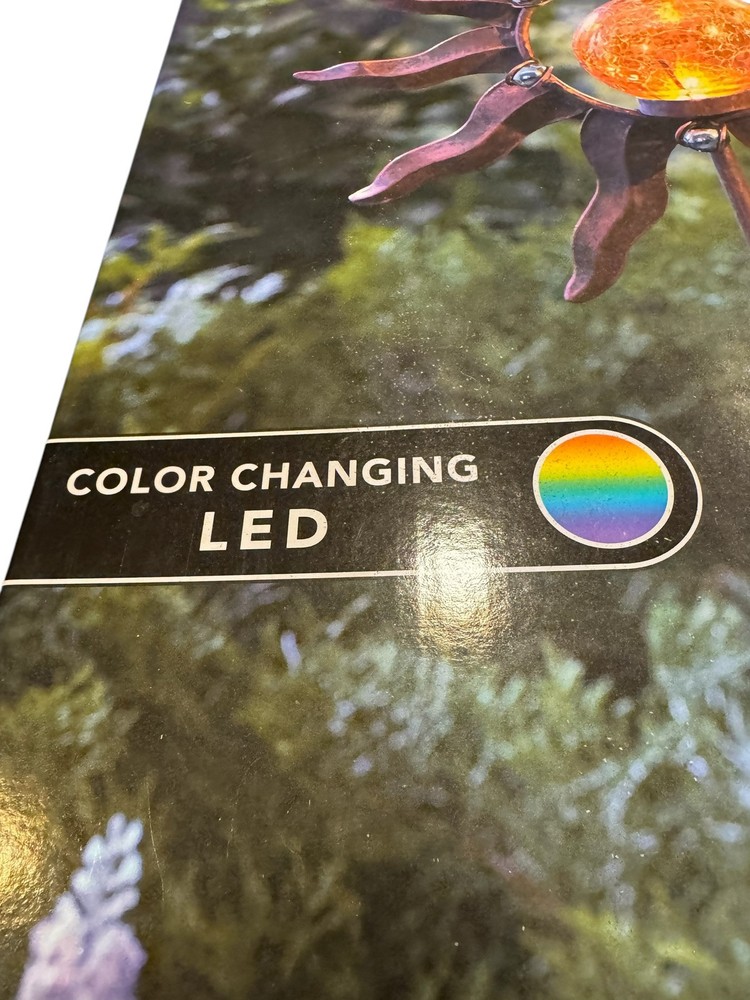 This is a solar-powered outdoor garden stake featuring a metal and glass design with a sun, moon, and star motif. It has a multicolor LED light that changes color and is waterproof. The stake is 40.8 inches tall with an art deco style, and it is suitable for outdoor installation. It has a switch control, a power consumption of 2.5 W, and uses a light sensor for activation.