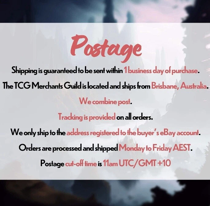 TCG Merchants Guild 🧙♂️🔥🧙 🧙♂️ Welcome To The Guild Store Traveler 🧙♂️ Reach out and contact the guild if you have any questions or offers! Postage 📦 Shipping is guaranteed to be sent within 1 business day of purchase . 📍 The TCG Merchants Guild is located and ships from Brisbane, Australia . 📬 We combine post . 💸 Tracking is provided on all orders . 📮 We only ship to the address registered to the buyer's eBay account. 🗃️ Orders are processed and shipped Monday to Friday AEST. ⌚ Postage cut-off time is 11am UTC/GMT +10 *Please note that any address not registered in eBay is not acceptable for shipping. ❓ FAQ ❓ What is the condition of the card(s)? All cards are in excellent or good condition; we check each card before sending. Good for use in play sets or collecting. NOTE: Though we endeavor to always give you the best possible card or cards, if you are after a gradable card(s), please message us. How will my card or cards be transported? Cards are sent via Australia Post. All cards are sleeved and placed in card savers. Packaged in Australia Post envelopes. For bigger purchases, we use Australia Post-padded satchels. How long until I get my card or cards? Handling time is 1 business day. Returns : We accept returns within Australia; however, return postage is at the buyer's expense. Only cards in their original state, as when originally sent, will be accepted. Damage due to customer handling is not covered by this policy. * Note: Sample cards have been used as a placeholder for the real card or cards. Rest assured, we have the card in hand. *