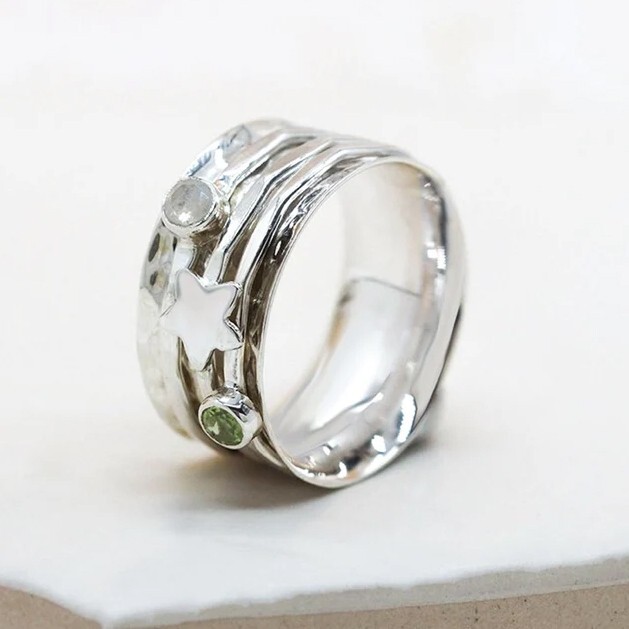 Product Overview: This beautiful 925 Sterling Silver Spinner Ring combines the elegance of Peridot and Rainbow Moonstone gemstones with the calming design of a spinner ring. Crafted from solid sterling silver, this unique ring is not only a stunning piece of jewelry but also offers stress relief and healing benefits through its interactive design and powerful gemstones. Key Features: Material : Solid 925 Sterling Silver – Known for its durability and timeless shine, perfect for everyday wear. Gemstones : Peridot : A vibrant green gemstone associated with emotional healing, abundance, and growth. Peridot is known to bring positivity and renewal. Rainbow Moonstone : A captivating gemstone with flashes of iridescent colors, believed to enhance intuition, balance emotions, and promote spiritual growth. Spinner Design : The outer band of the ring rotates freely around the inner band, offering a calming tactile experience. Great for stress relief and focus . Benefits of the Spinner Ring: Stress Relief : The spinning motion helps to relieve tension and anxiety. It’s perfect for fidgeting or when you need to calm your mind. Healing Properties : Both Peridot and Rainbow Moonstone are believed to support emotional healing, intuition, and spiritual growth. Stylish and Versatile : Suitable for casual wear or as a statement piece for special occasions. This ring can be worn as a personal reminder of peace, healing, and balance. Sizing and Fit: Available in various sizes. Please refer to the size chart to select your correct size. The ring has a comfortable fit, ideal for everyday wear. Perfect Gift for: Those seeking emotional balance and healing. Anyone who enjoys unique, meaningful jewelry. A special gift for birthdays, anniversaries, or as a thoughtful self-care item. Why Choose Our Spinner Ring? High-quality 925 sterling silver craftsmanship ensures durability and long-lasting beauty. The combination of Peridot and Rainbow Moonstone gemstones offers both spiritual and aesthetic benefits. Handcrafted with care to deliver a smooth, rotating mechanism for stress relief.