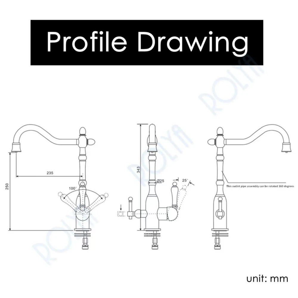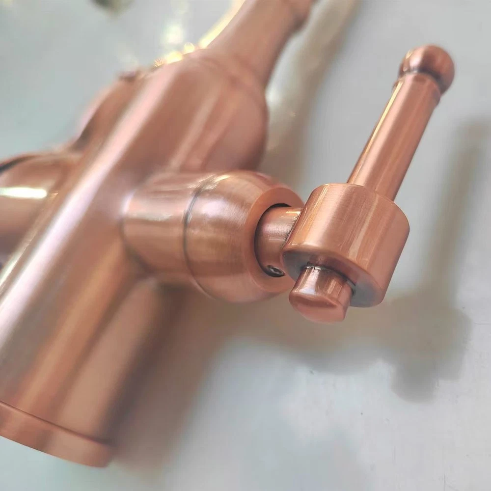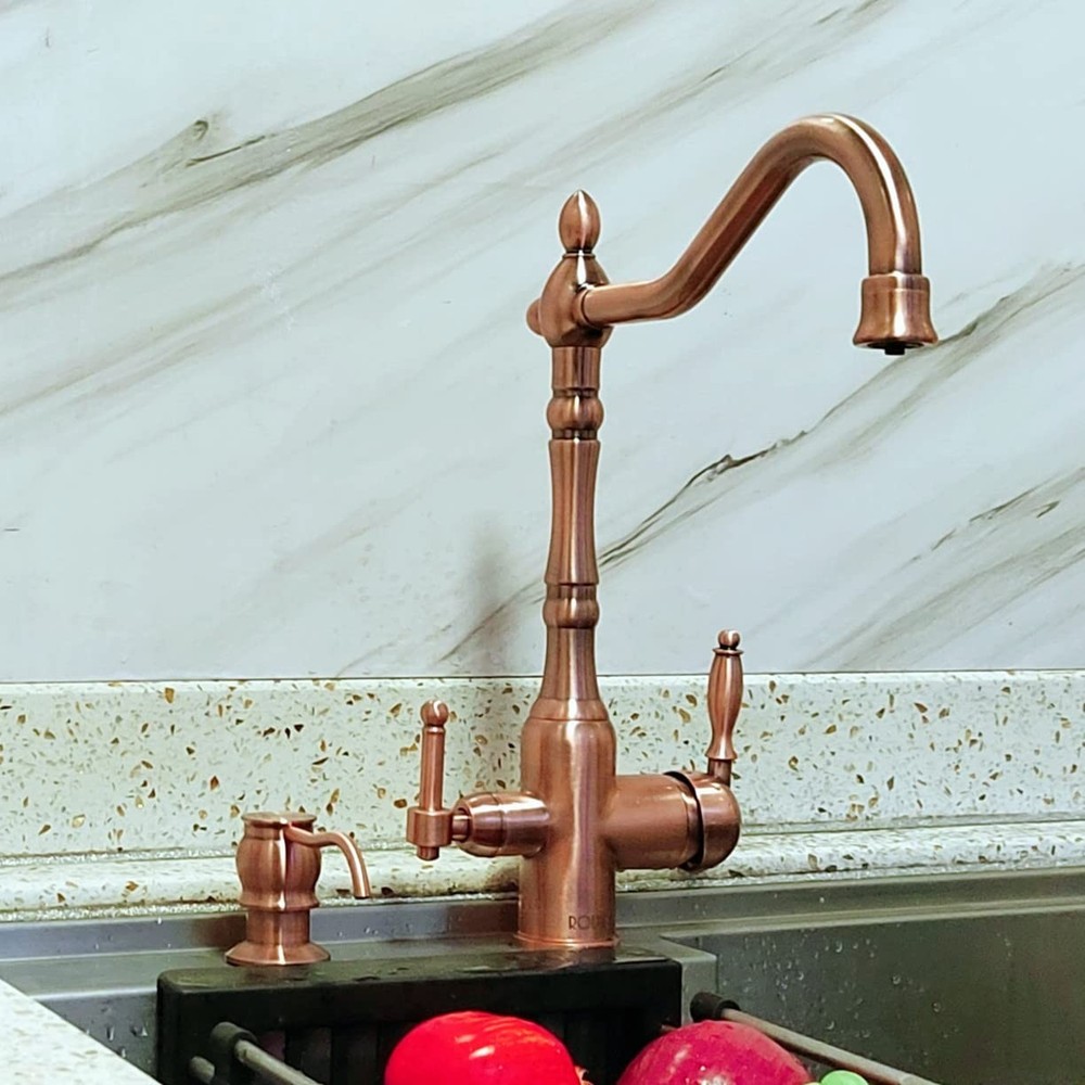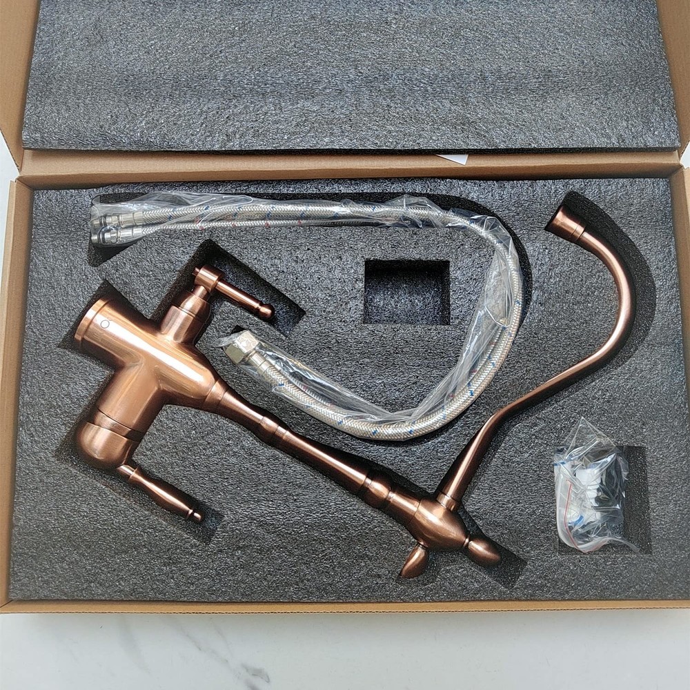 Solid Brass 3-Way Filtered Kitchen Faucet - Traditional Vintage Style Pure Water, Classic Design, Ultimate Convenience Upgrade your kitchen with the perfect blend of antique elegance and modern functionality. This premium 3-in-1 Triflow faucet eliminates the need for a separate drinking water tap, keeping your countertop clean and minimalist. 【WHY CHOOSE THIS 3-WAY FAUCET?】 3-In-1 Functionality: Dispenses Hot, Cold, and Filtered water through two independent levers. One single tap does it all! Safe & Pure: Features a separate internal tube for filtered water to ensure it never mixes with unfiltered tap water, providing your family with the highest purity. Space-Saving Hero: No need to drill an extra hole in your sink for a drinking water dispenser. Perfect for modern and traditional kitchens alike. 【PREMIUM CRAFTSMANSHIP】 Solid Brass Construction: Built to last with heavy-duty solid brass, offering superior durability and corrosion resistance. Exquisite Finish: The stunning Antique Copper finish adds a high-end, vintage touch to any kitchen decor. Smooth Operation: Equipped with a high-quality ceramic disc valve tested for 500,000 cycles to ensure drip-free performance and effortless handle control. 【KEY SPECIFICATIONS】 Material: Lead-Free Solid Brass Installation: Single Hole, Deck Mounted Spout Feature: 360° Swivel for full sink access Cartridge: Premium Ceramic Disc (500,000+ uses) Dimensions: Height: 13.5" | Spout Height: 9.8" | Spout Reach: 9.25" 【EASY INSTALLATION】 Everything you need for a quick DIY setup is included: 1 x 3-Way Kitchen Faucet 2 x Flexible Hot & Cold Water Hoses (3/8" Fittings) 1 x Filtered Water Adapter (Fits standard 1/4" tubing) User Manual & Mounting Hardware 【WARRANTY & SERVICE】 2-Year Quality Warranty: We stand behind our products. 30-Day Hassle-Free Returns: Not satisfied? Return it with ease. Fast Shipping: Dispatched from our warehouse within 1-3 business days.