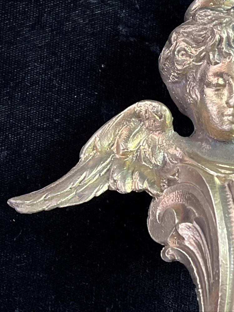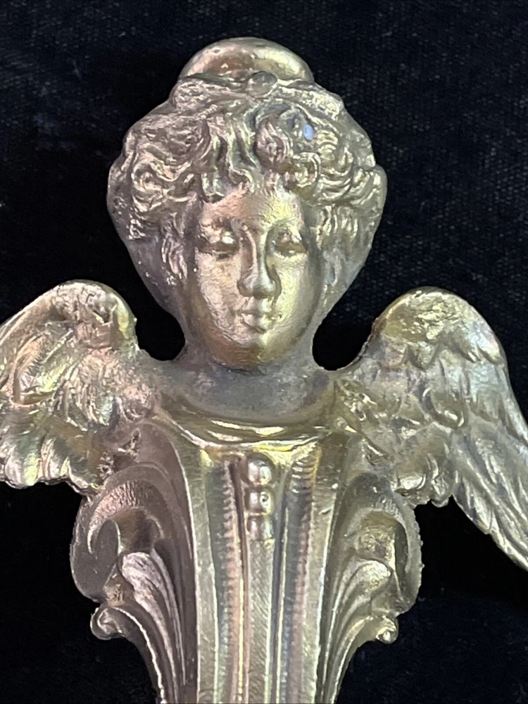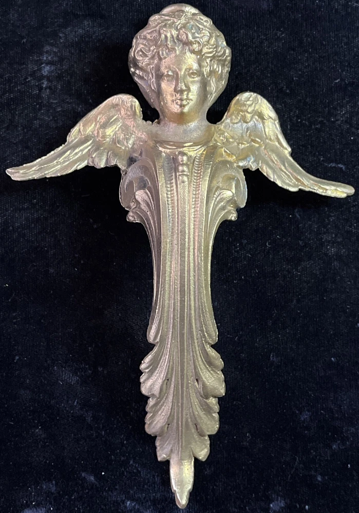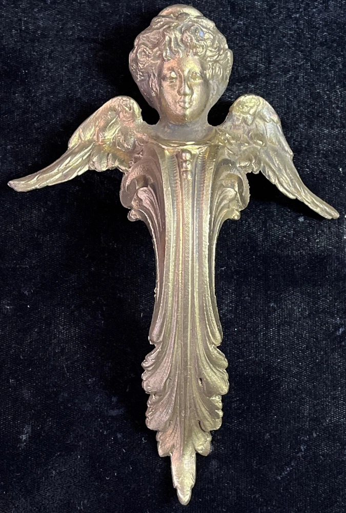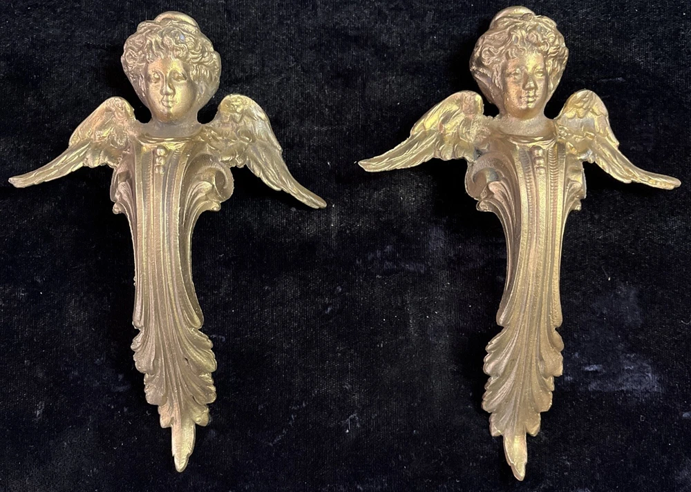 Handsome antique set of 2 brass or bronze winged angels. These can be used however you wish. Mount them or the corners of a beautiful piece of furniture or turn them into door knickers or ornaments. Angels measure 7” long and 5” wide and are heavy weighing 1lb 8oz collectively. See photos for more details any questions please feel free to contact us.