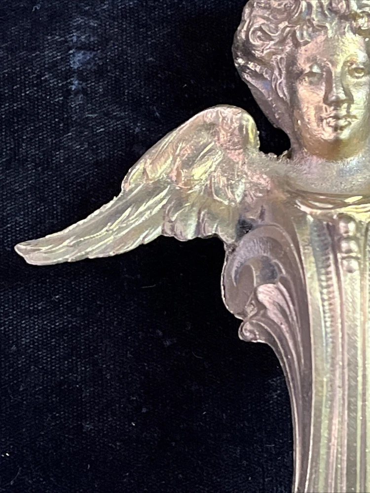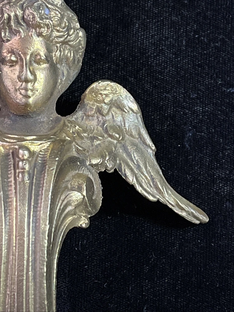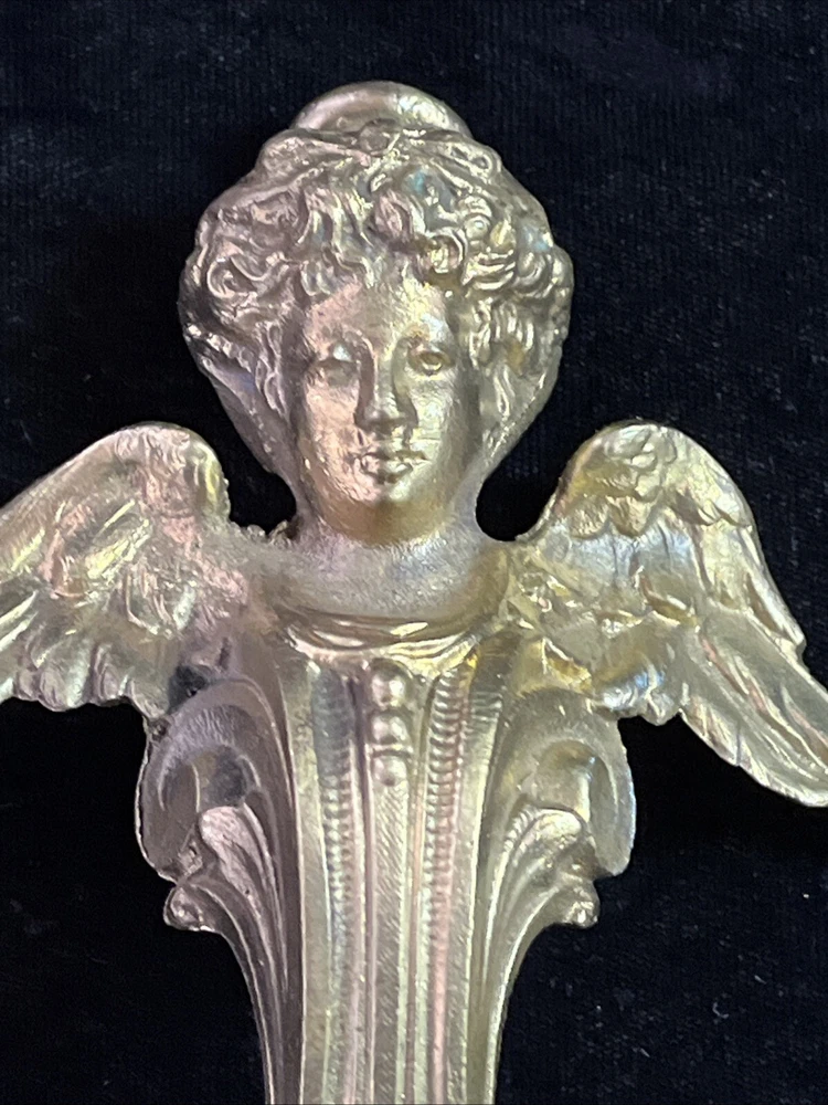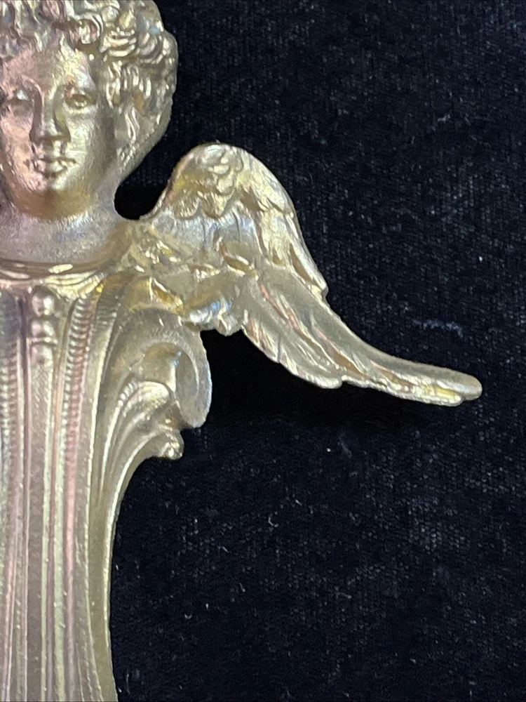 Handsome antique set of 2 brass or bronze winged angels. These can be used however you wish. Mount them or the corners of a beautiful piece of furniture or turn them into door knickers or ornaments. Angels measure 7” long and 5” wide and are heavy weighing 1lb 8oz collectively. See photos for more details any questions please feel free to contact us.