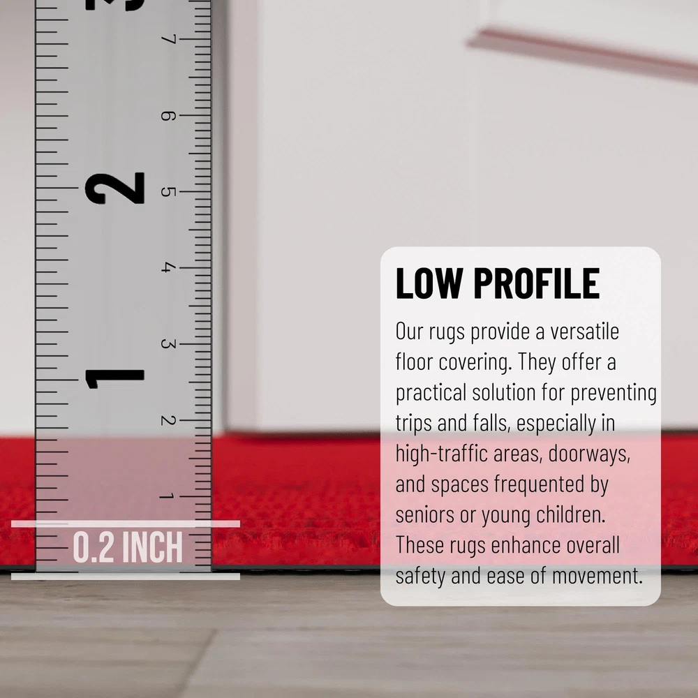 Introducing our Custom-Sized Runner Rug, expertly crafted in India with premium polyester and a TPR backing for indoor and outdoor use. Available in widths of 2, 3, 4, and 7 feet, and customizable lengths of up to 55 feet, this rug offers the perfect fit for any space. Easily trim to your desired size for a tailored look. Upgrade your space with this versatile and durable rug solution. [KEY ATTRIBUTES]: Size: 2'7" x 7' (3' x 7') | Thickness: 0.2 in. | Color: Red [ULTRA THIN PILE]: An ultra thin pile thickness of 0.2 inches offers ideal functionality that is perfect for busy areas, underneath furniture, and in entryways as it will not obstruct doorways. [NONSLIP & STAIN RESISTANT]: Made in India with high quality and stain resistant Polyester material. The rubber backing minimizes slipping. To ensure comfort and additional grip please purchase double sided rug tape. [KID & PET FRIENDLY]: Safe for everyday high foot traffic areas and more resistant to life’s unpredictable messes from kid or pet activity. [CUSTOMIZABLE]: These rugs are easy to cut into any size to fit your exact measurements. Cut them to your desired size and add the finishing touches to your hallway, entryway, garage, office, living room, patio, deck, finished basement, and laundry room.