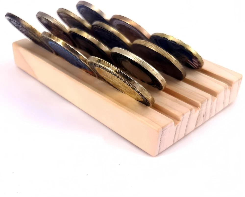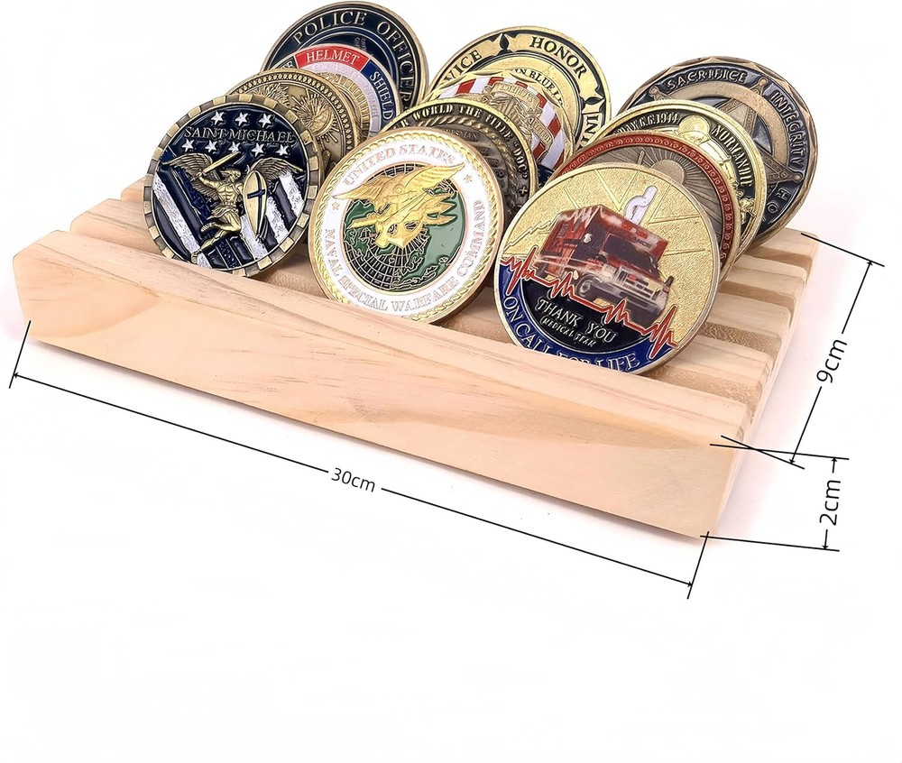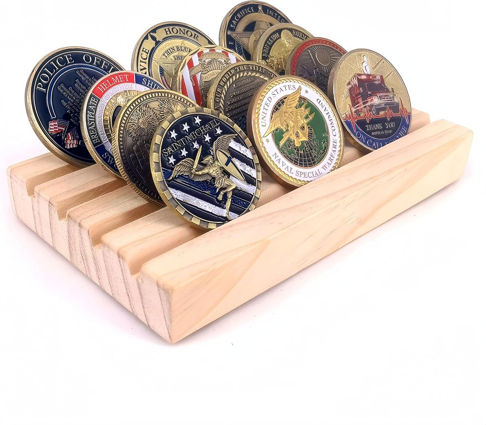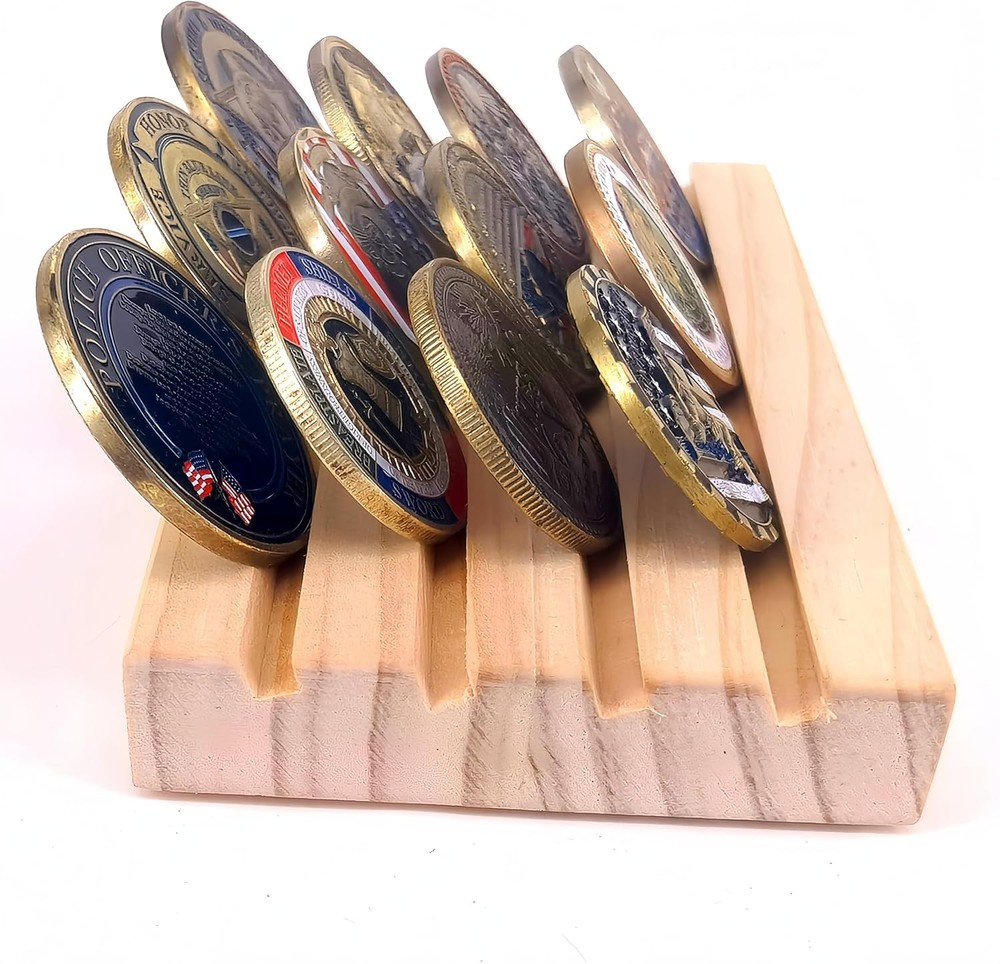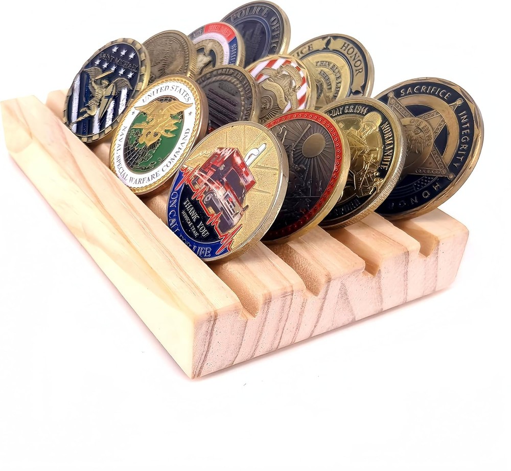 1. This sturdy wooden display holder is perfect for showcasing military challenge coins in a clean, organized way. Well-crafted with four neat rows, it gives any collection a professional look. I love how the natural brown wood grain adds a classic touch to my memorabilia. The compact size fits nicely on desks or shelves, and the lack of assembly is a huge plus. My coins stay securely in place while making them easily visible—exactly what I needed for my display. Great quality at an affordable price!