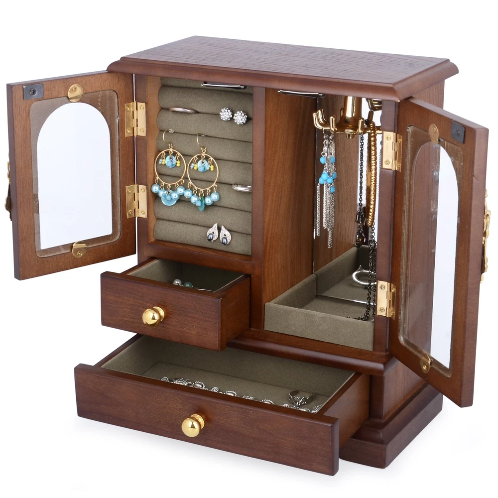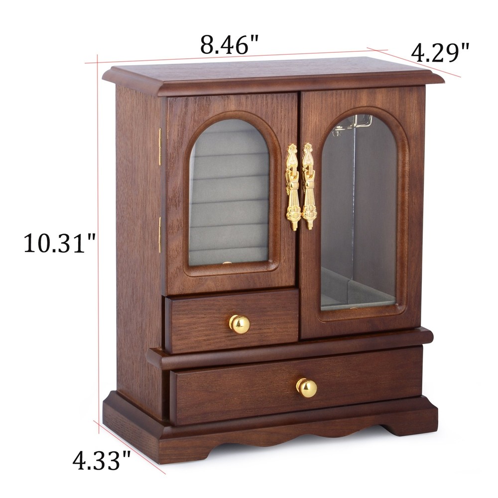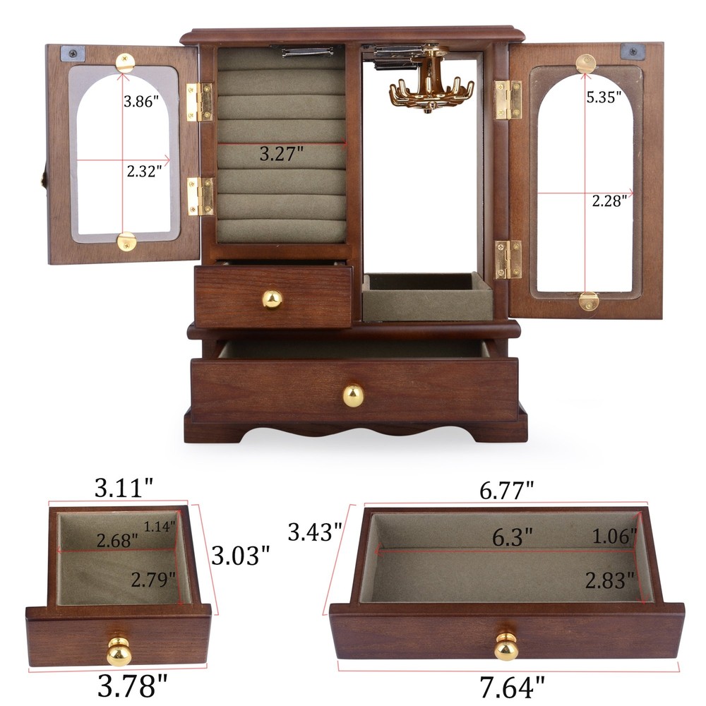 High-Jewelry Box: Solid wooden jewelry box and display acrylic place, perfect for storing and organizing your jewelry collection External Designed: External design features a unique wavy shape at the bottom, 2 drawers storage, each with a metal knob, and openable glass doors on both sides, making it smooth, clean, comfortable, and beautiful Internal Designed: Internal design includes a left part with 7 suede-lined ring slots and a removable square drawer, a right part with a mirrored back, 8 hooks carousel with storage ledge, and a large bottom drawer, providing ample storage space for your necklaces, bracelets, earrings, earpins, hairpins, watches, and other jewelry accessories Minimalist Storage - Minimalist storage design makes it a space saver and perfect for home living room, bathroom decoration, or as a makeup organizer, neatly organizing all your jewelry on the dressing table without taking up too much space Measures: Measures 8.46"L x 4.33"W x 10.31"H when closed, with left and right mirrors measuring 3.86"L x 2.32"W and 5.35"L x 2.28"W respectively. Refer to the picture for drawer size details Ideal Gift for Different Day - Ideal gift for different occasions, including birthdays, Christmas, weddings, Valentine's Day, Women's Day, Mother's Day, Father's Day, and anniversaries for your beloved ones
