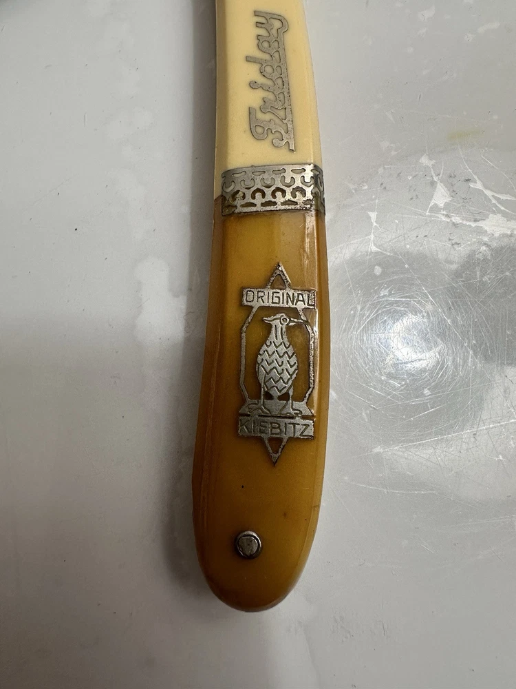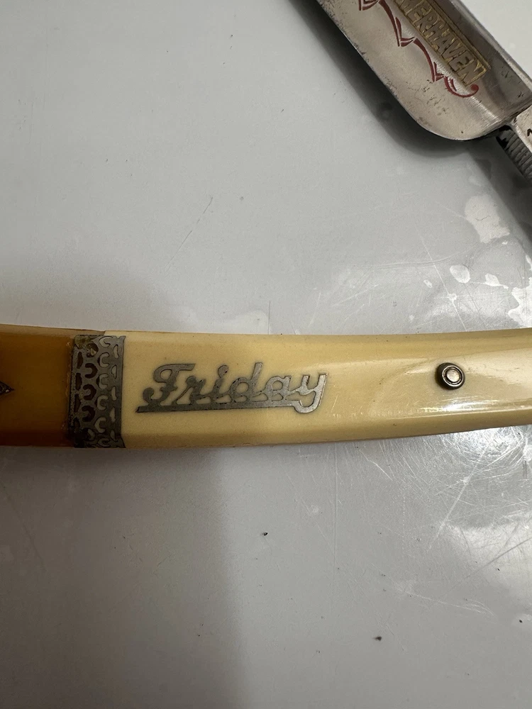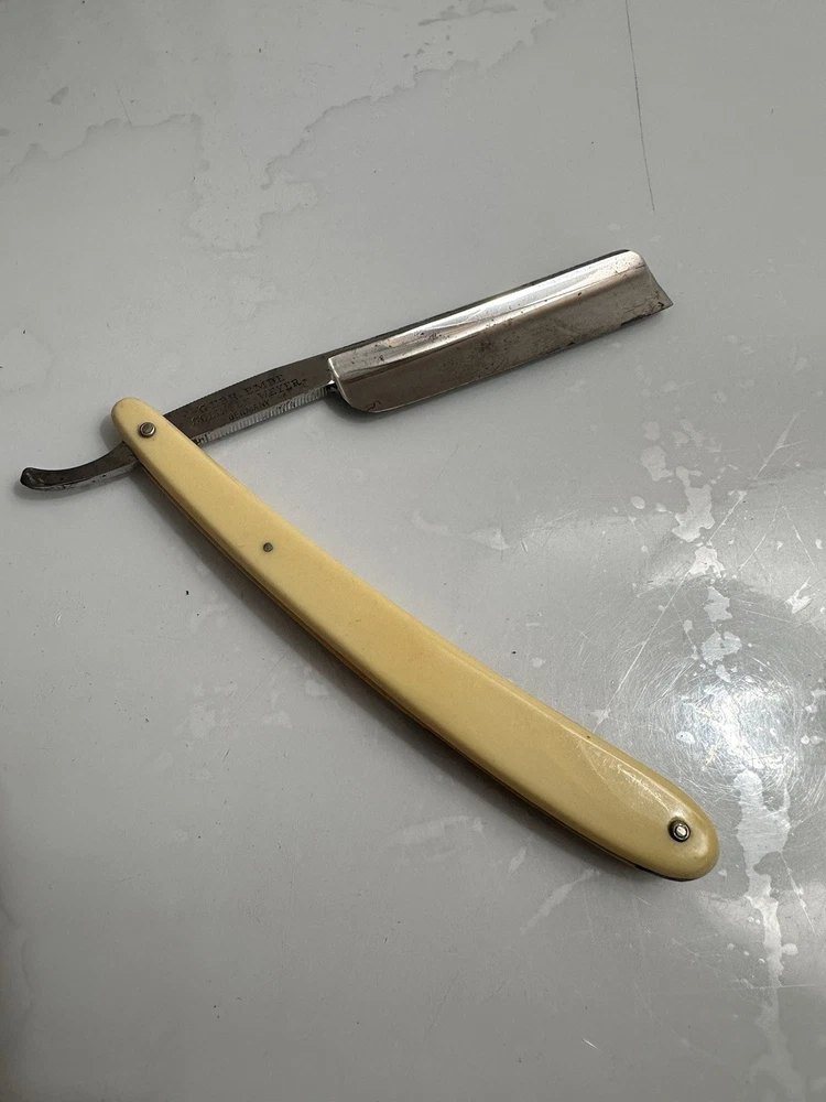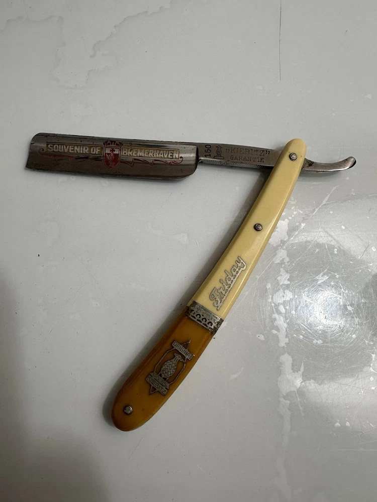 The Solingen Kiebitz 150 Friday Straight Razor features a unique yellow and white handle with intricate inlay details. This straight razor hails from Germany, known for its high-quality craftsmanship in the shaving industry. With a nod to tradition and a touch of style, the Solingen Kiebitz 150 Friday Straight Razor is a collector's item that combines functionality with artistry, making it a standout piece in any shaving collection.