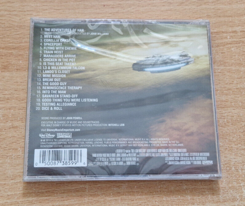 JOHN WILLIAMS / JOHN POWELL - SOLO: A STAR WARS STORY (FILM SOUNDTRACK) CD NEW/SEALED Track Listing 1 The Adventures Of Han Composed By, Conductor – John Williams (4) 3:49 2 Meet Han 2:20 3 Corellia Chase 3:34 4 Spaceport 4:07 5 Flying With Chewie 3:30 6 Train Heist 4:48 7 Marauders Arrive 5:14 8 Chicken In The Pot 2:09 9 Is This Seat Taken? 2:36 10 L3 & Millennium Falcon 3:16 11 Lando's Closet 2:13 12 Mine Mission 4:10 13 Break Out 6:15 14 The Good Guy 5:24 15 Reminiscence Therapy 6:13 16 Into The Maw 4:49 17 Savareen Stand-Off 4:26 18 Good Thing You Were Listening 2:08 19 Testing Allegiance 4:21 20 Dice & Roll 1:54