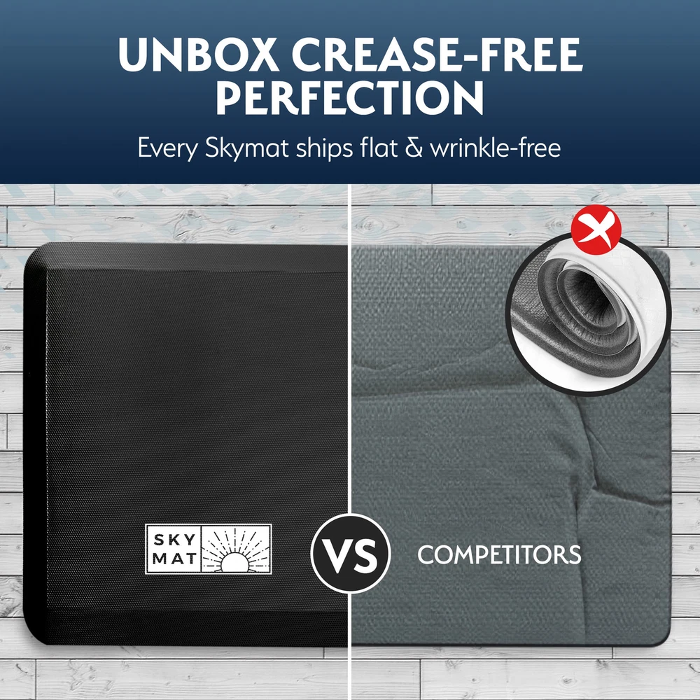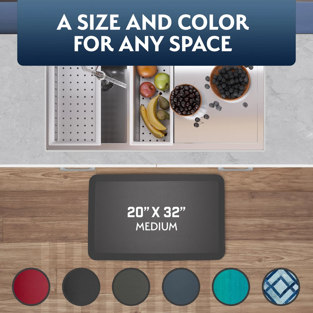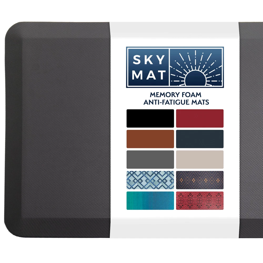 EXPERIENCE COMFORT - Our high-quality 3/4" thick high-density PU foam provides relief for your feet and absorbs the shock that you would normally feel in your legs. Our mat was designed to maintain density while standing for extended periods. NON SLIP BOTTOM - Equipped with a padded non slip bottom so that the standing mat stays in place both on hard and carpet floors. FOR PERSONAL AND COMMERCIAL USE - For the office as a standing desk mat, or for use in the kitchen, garage, or laundry room, our padded anti fatigue mats will relieve your discomfort and protect your floors from stains. STAIN RESISTANT TOP - Diamond top design prevents debris or stains from permanently smudging the mat. Clean spills and dirt with a quick wipe! SHIPS FLAT PACKED - We ship our mats flat to avoid permanent creases on our quality foam. Our cushioned kitchen mats are durable and we offer a variety of beautiful designs.