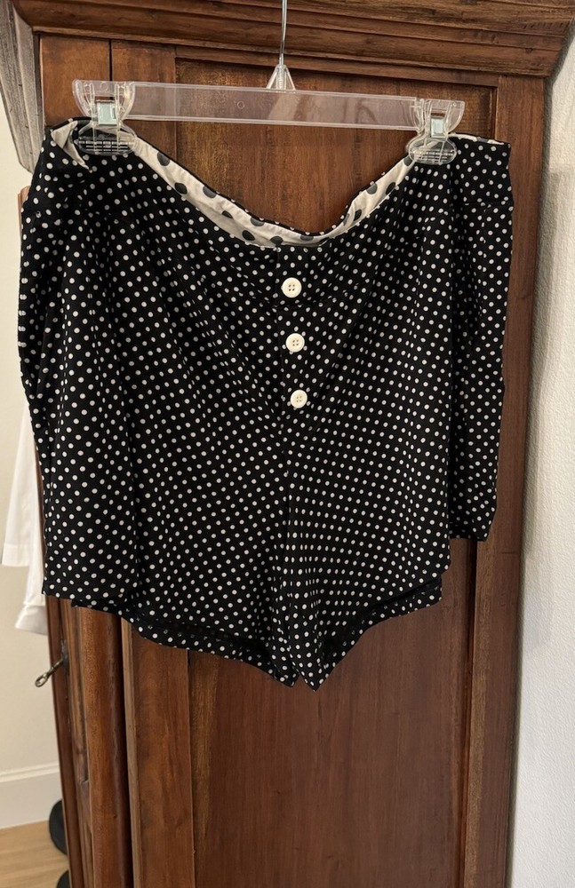 Note: two sizes in this pj set. Measurements: Large Top length is 26”, width is 22” (from armpit to armpit) and sleeve length is 24”. XL shorts have an elastic waist of 36”; with a 4” inseam. The shorts measure 13” from top to bottom. Soma Intimates women's pajama top and shorts. Top is size large and bottoms size XL. The black and white polka dot shorts reminiscent of a Dalmation's coat. Made with a blend of rayon and spandex, the fabric is soft and stretchy for a comfortable fit. The long sleeve top has buttons and is collared. The shorts are pull-on closure allowing for easy wear with 3 white decorative front buttons. The garment care is simple, as it is machine washable. This items are preowned but in good condition with no visible stains or flaws, unless specifically pointed out in photos. Color: We photograph items as accurately as possible; however, colors may vary depending on your monitor and the lighting.