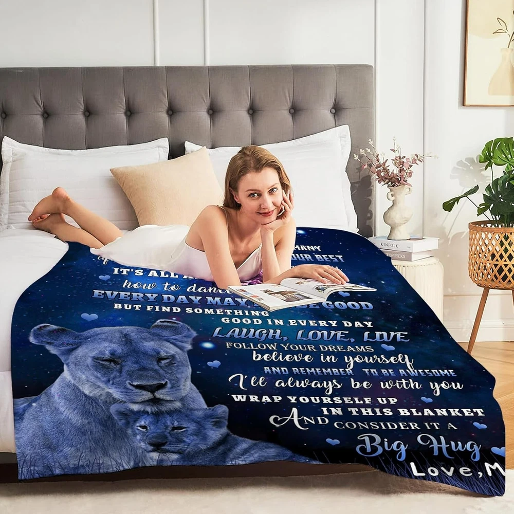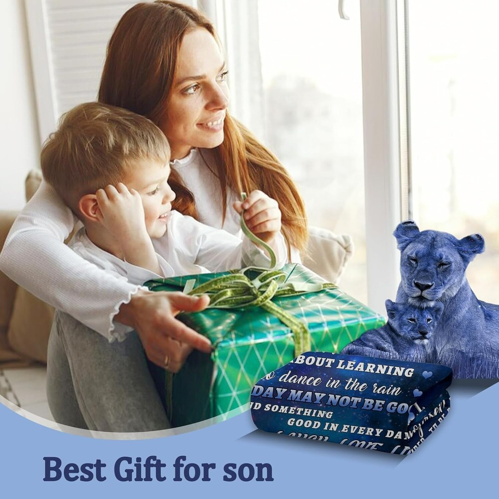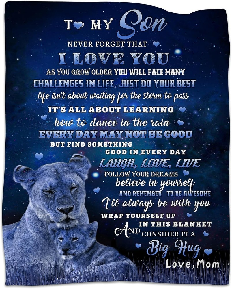 Son Blanket Gift from Mom, Son Lion Blanket 50"x60", Blankets for Son from Mom, Son Blanket from Mom, Son Gifts, Son Birthday Gifts, Fathers Day Valentine Gift for My Son Flannel Throw Blanket Polyester 【Meaningful Son Gifts】The blanket for son design is a timeless piece, it's the ideal way to remind him of the unbreakable bond with their parents. When he encounters life's trials and tribulations and seeks comfort during periods of illness, sadness or depression, this son blanket will provide comfort, provide support and heal - "I love you, Son". Perfect as mom to son gifts, son gifts from mom, son blanket from mom 【Perfect SIZE】60 × 50 Inches(150 × 125cm), perfect size for teens adults, lightweight and foldable, suitable for use in various places, convenient to carry. The unique creative design and soft feeling of the blanket make it an even warmer gift for son. Suitable for use in all seasons and anywhere throughout the , such as a sofa, bed, Living Room or recliner at home, and even outdoor activity use is a good choice. Your son can use it when lounging on a couch for reading or watching TV, or snuggling companion for chilly nights. Also he can also take it outside for traveling, camping, hiking, backpacking and more 【High Quality】Made of anti-pilling flannel, more comfortable and warm, Light weight, and can be folded compactly. Completely resist shrinkage and wrinkles. Our blanket has a velvety fuzzy feeling, soft touch, anti-pilling, anti-wrinkle, anti-allergic, and non-shedding characteristics. With this blanket, you can have a sweet dream at night 【Washing】Machine wash and hand wash, quick-drying, easy to care, do not use bleach 【Son Birthday Gifts】Definitely surprise your son! Soft & Comfy throw blanket with heart warming words makes it a great gift to your son for her Birthday, Fathers Day, Christmas, Halloween, Easter, Thanksgiving, Graduation, Wedding, Valentines Day and other festivals to send your son, to bring him love and blessings. This blanket will keep the happy, memorable, warm and joyful moments with your family and loved ones. Always reminder him - No matter how far you go in life, your blessing will always be with him. Whenever son is at home or going out, this soft warm hug blanket can accompany him anytime Welcome to ! Hope You Can Find Your Favorite Blankets Here. Have Fun!