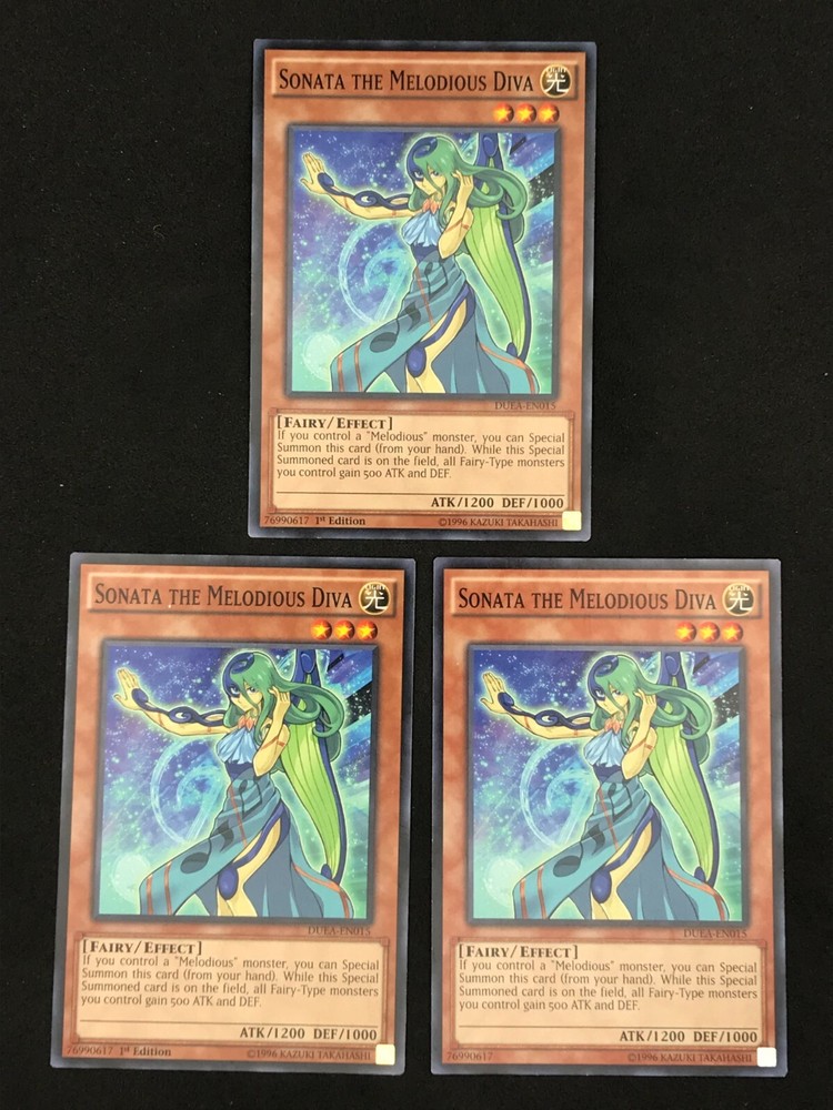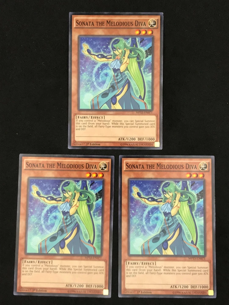 Listing is for a playset of 3x Sonata the Melodious Diva YuGiOh cards. Th e condition and edition of the playset is specified in the drop down list. The pictures associated with the selection in the drop down list are of the actual cards you will receive. Condition of the card is as pictured. Card will ship in a plain white envelope via Ebay Standard Envelope service. Additional cards ship free when purchased at the same time using the cart feature. The cards must be purchased at the same time and not individually for the shipping discount to be automatically applied. Shipping by Bubble Mailer using USPS Ground Advantage is also available under shipping options for an additional charge. International Buyers - I use the eBay International Shipping Program for international shipments. The international portion of the shipment is handled by eBay and the shipping price is set by eBay. I have no control over the shipping price they set.