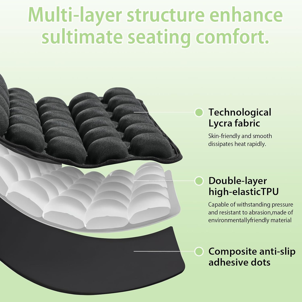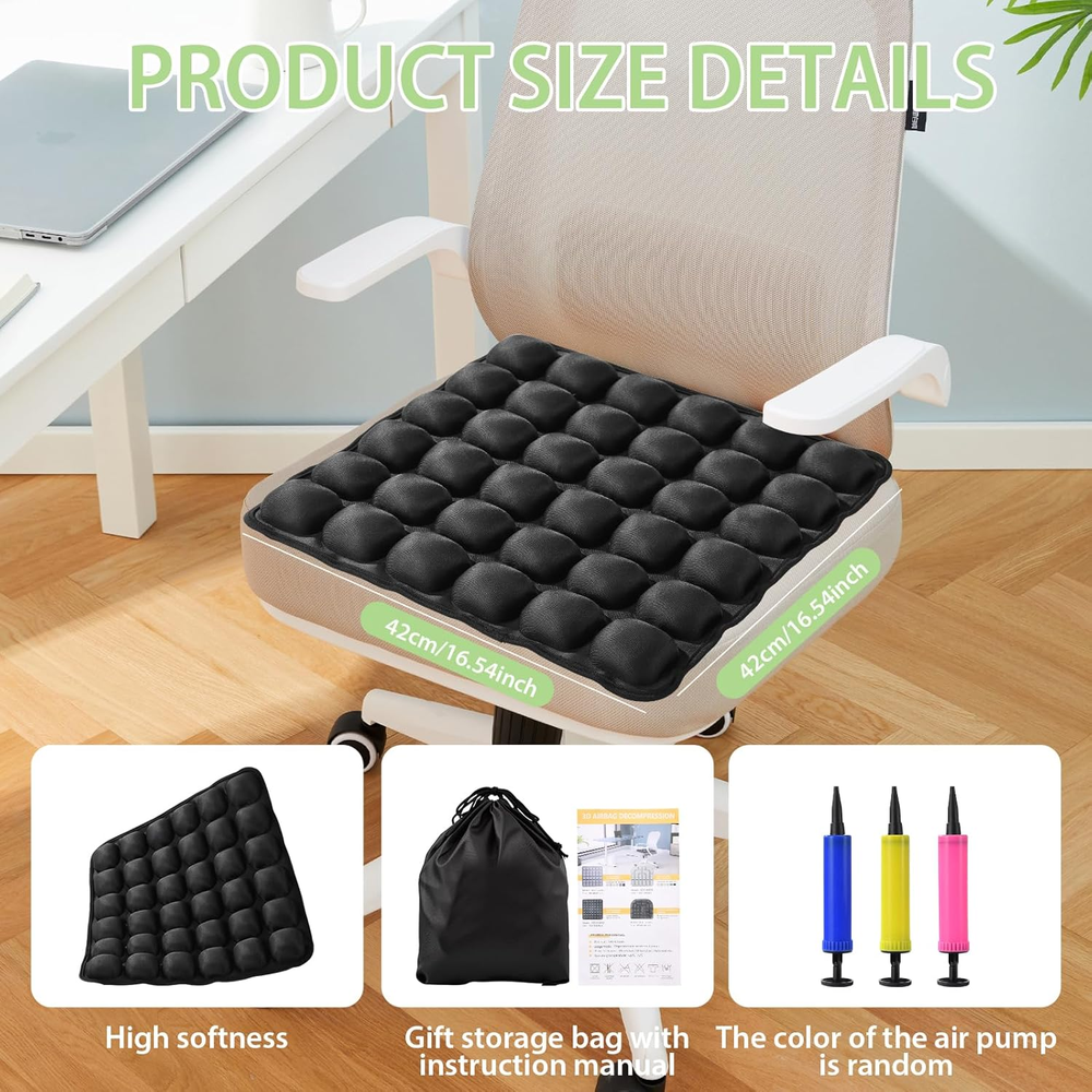 Sondur Travel Cushion Airplane Seat, Portable Inflatable Travel Seat Cushion for Long Flights, Office Chair, Wheelchair, Cars, Home Living, Ergonomic Comfort Support 【Ergonomic Design】: Engineered to address common airplane seat discomfort, this cushion contours to your body's curves. It prevents fatigue during extended periods of sitting, helping you conquer long flights and leave “flight anxiety” behind. 【Lightweight and Portable】: Fits Any Seat Measuring 16.77 inches × 16.77 inches × 1.38 inches, sondur travel cushion fits standard airplane seats, car seats, and office chairs. It easily slips into your carry-on bag, ready for business trips or getaways, ensuring consistent comfort wherever you go. 【Comfort & Pressure Relief】: Experience space-age comfort with our 3D Air Cell Technology system. Independently tested to provide 72% greater pressure relief than memory foam cushions. Hexagonal air chambers simulate zero-gravity support, offering relief for your tailbone during flights exceeding 12 hours. 【Premium Materials & Sandwich Construction】: Durable and hygienic. Crafted from high-quality TPU material, it offers puncture resistance and easy cleaning. The breathable surface prevents sweating, unlike bulky memory foam cushions. 【Universal Anti-Slip Design】: Silicone grips securely anchor to airplane seats, car seats, wheelchairs, and office chairs, ensuring stability even during turbulence or sudden movements. 【Airplane Seat Cushion Customizable Comfort】 After being filled with air, you can press the exhaust valve button to adjust the gas in the seat cushion to a comfortable level. The daily airplane seat cushion can be inflated to 60-70%; the inflation volume is 40-50% during flight to cope with changes in plateau pressure. 【Ergonomic Design】: Engineered to address common airplane seat discomfort, this cushion contours to your body's curves. It prevents fatigue during extended periods of sitting, helping you conquer long flights and leave “flight anxiety” behind. 【Lightweight and Portable】: Fits Any Seat Measuring 16.77 inches × 16.77 inches × 1.38 inches, sondur travel cushion fits standard airplane seats, car seats, and office chairs. It easily slips into your carry-on bag, ready for business trips or getaways, ensuring consistent comfort wherever you go. 【Comfort & Pressure Relief】: Experience space-age comfort with our 3D Air Cell Technology system. Independently tested to provide 72% greater pressure relief than memory foam cushions. Hexagonal air chambers simulate zero-gravity support, offering relief for your tailbone during flights exceeding 12 hours. 【Premium Materials & Sandwich Construction】: Durable and hygienic. Crafted from high-quality TPU material, it offers puncture resistance and easy cleaning. The breathable surface prevents sweating, unlike bulky memory foam cushions. 【Airplane Seat Cushion Customizable Comfort】 After being filled with air, you can press the exhaust valve button to adjust the gas in the seat cushion to a comfortable level. The daily airplane seat cushion can be inflated to 60-70%; the inflation volume is 40-50% during flight to cope with changes in plateau pressure. 8.74 inches x 8.9 inches x 2.99 inches. Weight: 1.04 lb Item model number sondur travel cushion Age Range (Description) Adult Color Black Fabric Type Tpu Item Weight 1.04 pounds Shape Rectangular Use for Buttocks Model Name sondur travel cushion Recommended Uses For Product Driving Fill Material Polyurethane (PU) Special Feature Foldable Package Dimensions 8.9 x 8.74 x 2.99 inches