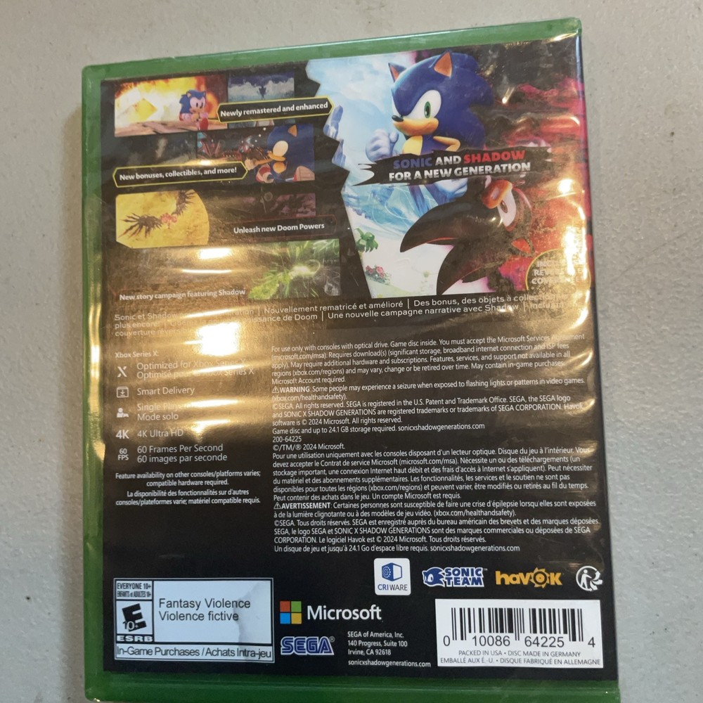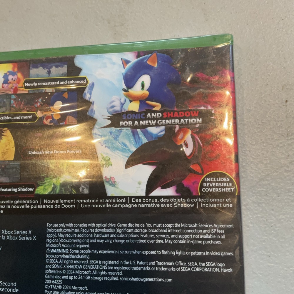 "Sonic X Shadow Generations on the Microsoft Xbox Series X|S is a highly anticipated addition to the Sonic the Hedgehog video game series by Sega Games. With a rating of E10+ (Everyone 10+), this platformer and action-adventure game promises to deliver exciting gameplay and immersive experiences for fans of the iconic blue hedgehog. The game includes one disc, offers a manual included feature, and is set to release in 2024 in NTSC-U/C (US/Canada) region."
