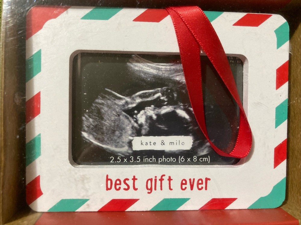 The Sonogram Best Gift Ever Ornament is a rectangular wooden ornament measuring 4.5x3.5 inches, featuring a red color and a hanging design. Manufactured in 2019 by Pearhead Inc, this original ornament is perfect for celebrating a pregnancy or baby-themed occasion like Christmas. The ornament is a thoughtful gift for a daughter, with a theme of Christmas and a subject of a baby. This new in box collectible is a unique and heartfelt addition to any holiday ornament collection.
