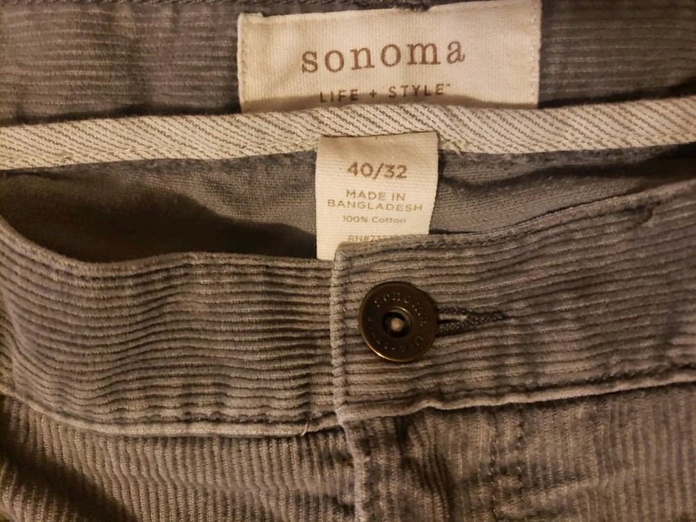 Elevate your wardrobe with these stylish and versatile Sonoma Courduroy Pants. The light gray color and classic fit make them perfect for any occasion, whether it be travel, casual outings or business meetings. The pants feature a zip and button closure, along with a 5-pocket design, providing ample storage space for your essentials. Crafted from high-quality cotton corduroy fabric, these pants are durable and machine washable for easy care. The mid-rise waist and straight leg style provide a comfortable and flattering fit for men. The Sonoma Life+Style model is a must-have addition to any fashion-forward wardrobe. They have been machine washed and line dried. From a smoke free, pet free home. Message me with any questions. Thanks for looking.