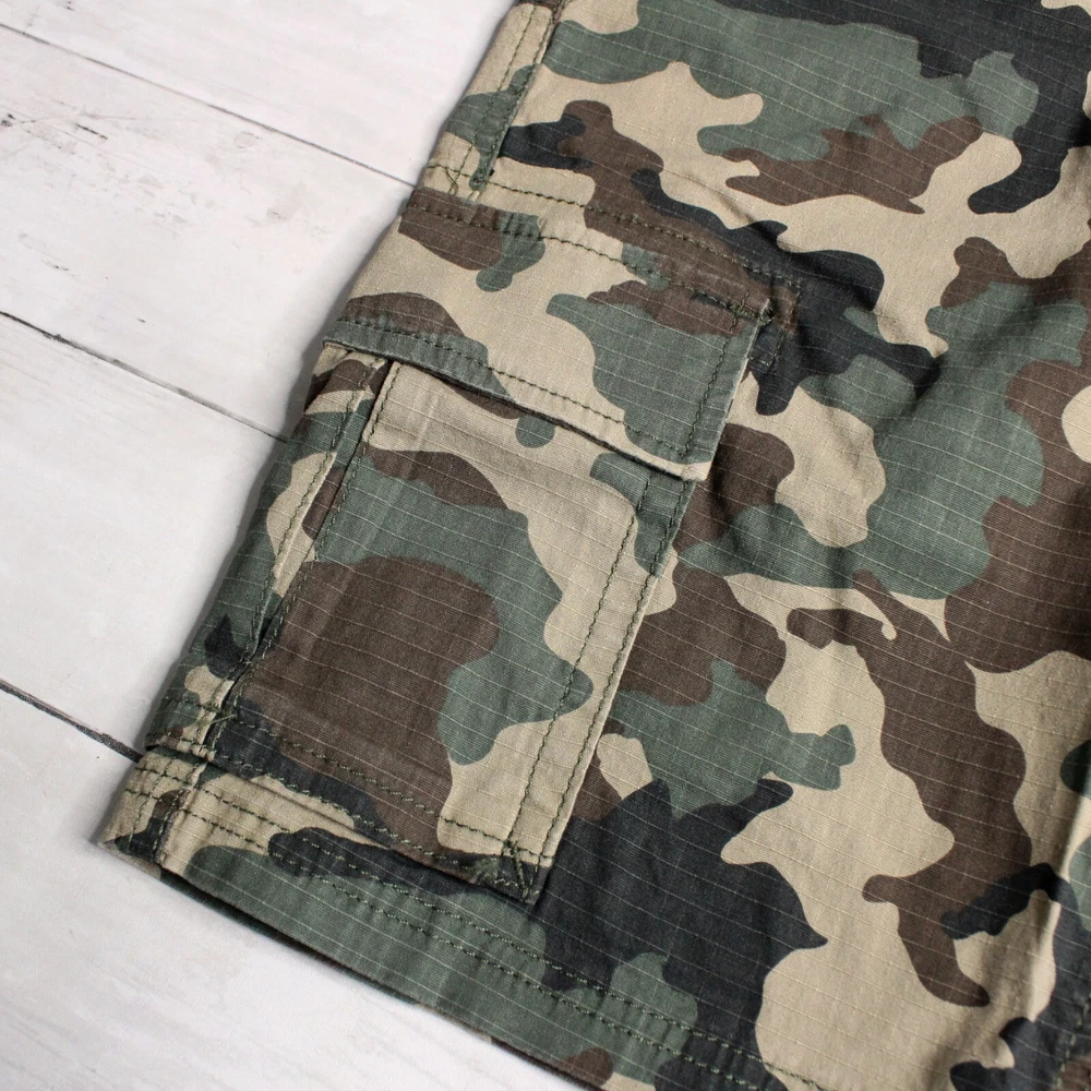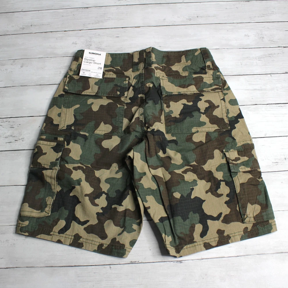 New with Tags Sonoma Casual Ripstop Cargo Shorts Flat Front Hits Above Knee Flexwear Stretch Fabric Approximate 10" Inseam Wide Hidden Elastic Waist with Zipper Front Cargo Pockets 98% Cotton 2% Spandex Colors: Olive Drab, Brown and Khaki Tan Men's Size 28 Retail $40.00 These cargo shorts are really nice quality and are brand new with tags.