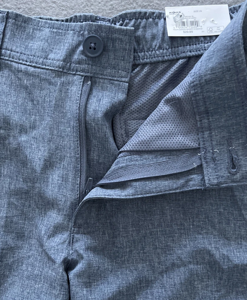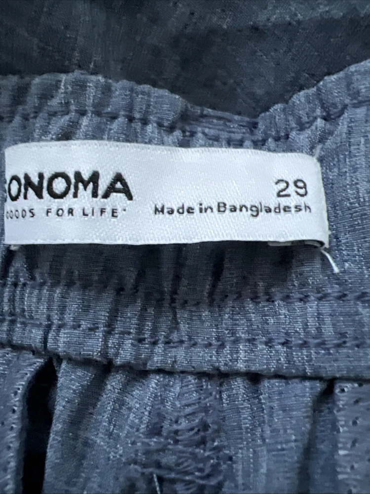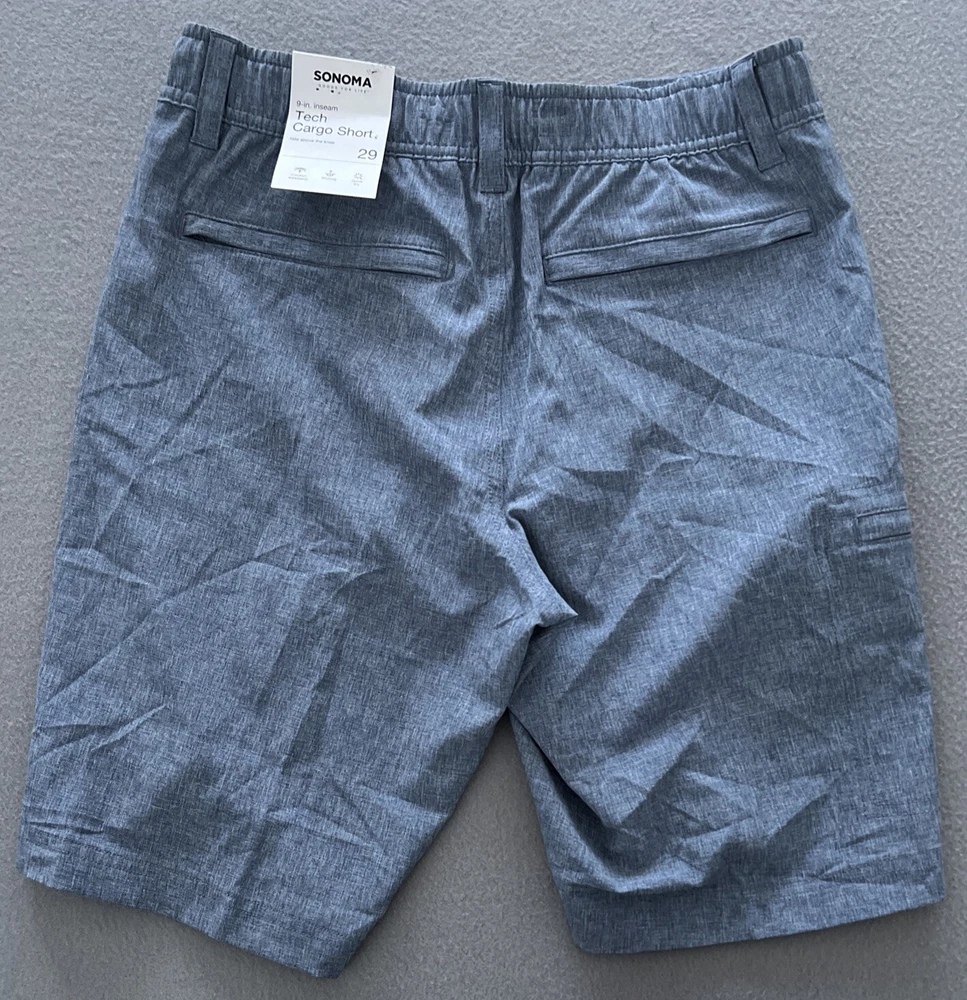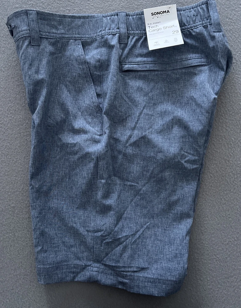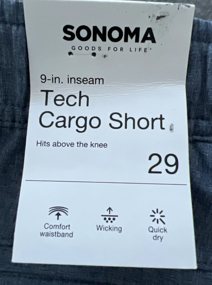 Pattern: Solid Size Type: Regular Handmade: No Country/Region of Manufacture: Unknown Material: Polyester Inseam: 9 in Fabric Wash: Dark Brand: Sonoma Pocket Type: Cargo Pocket Front Type: Flat Front Waist Size: 29 in Personalize: No Character: Stretch Features: Easy Care, Elastic Waist, Moisture Wicking, Pockets, Quick Dry, Stretch, Comfort waistband Department: Men Size: 29 Fit: Regular Style: Cargo Closure: Zip Vintage: No Occasion: Casual, Travel Fabric Type: Canvas Theme: Outdoor, Southwestern Color: Blue