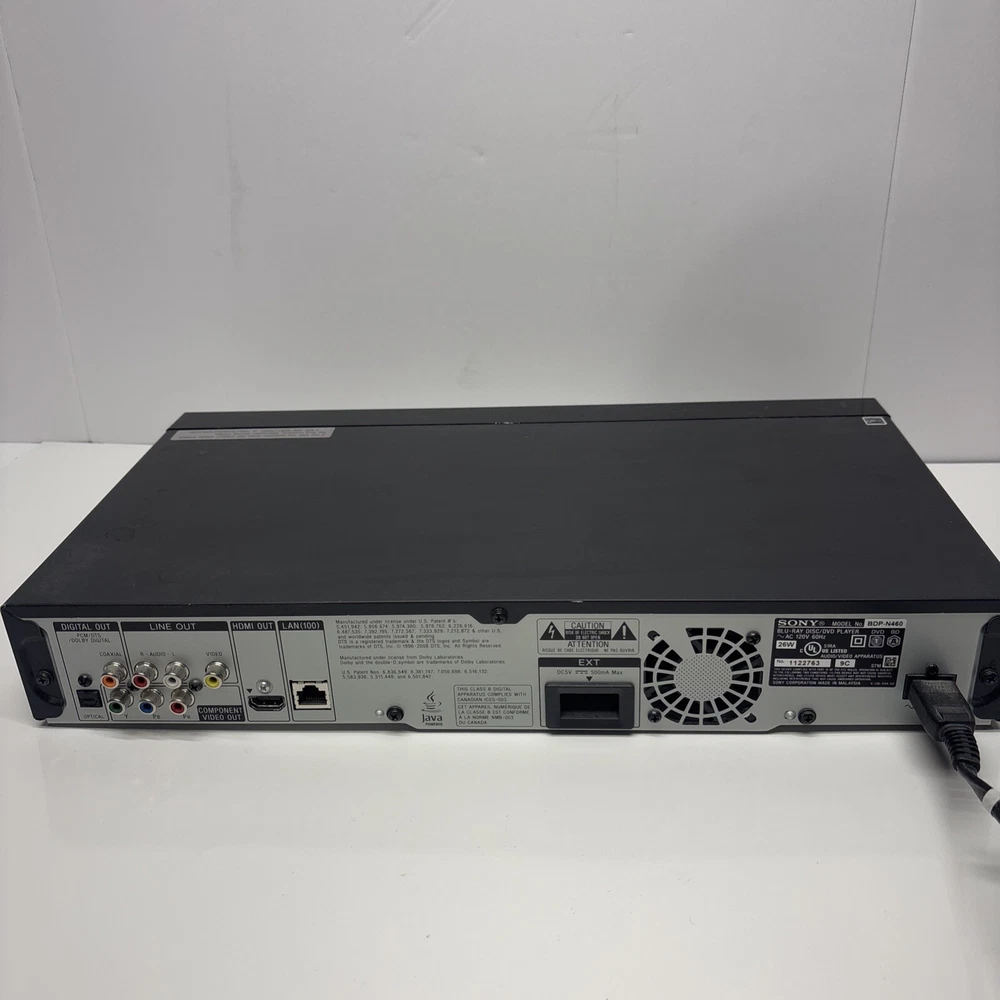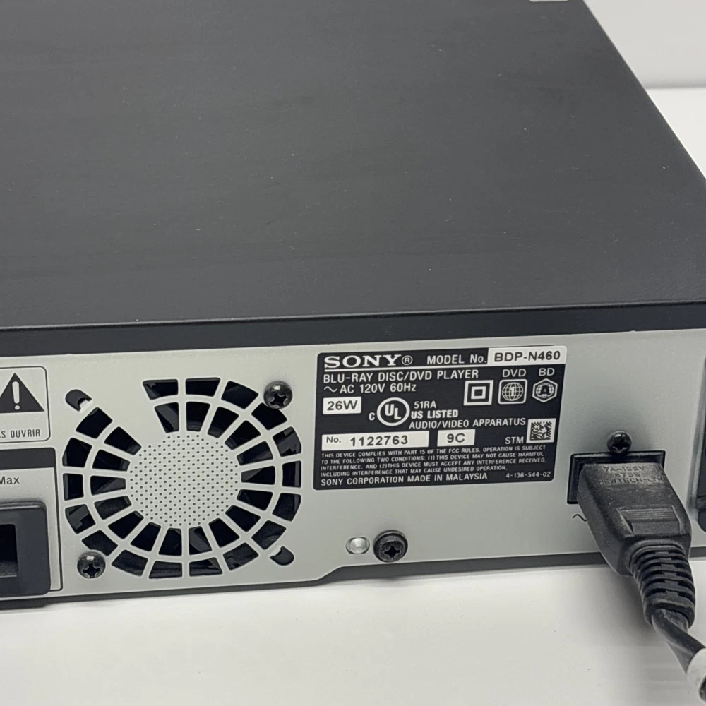 This is a Sony Blu-ray Disc DVD Player model BDP-N460 with AVCHD and HDMI connectivity. It is in black color and can play DVD and Blu-ray discs at a maximum resolution of 1080p (FHD). The unit does not come with a remote but has been tested and is in working condition. It includes features like composite video RCA and HDMI connectivity. Made in Malaysia.