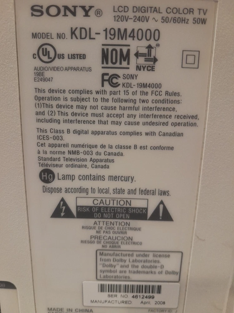 Sony Bravia KDL-19M4000 19" LCD HDTV Gaming TV with Remote Control NOTE: Tested/works. Original packaging box and user's manual are NOT INCLUDED .