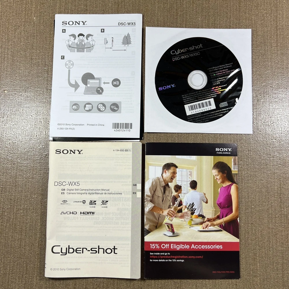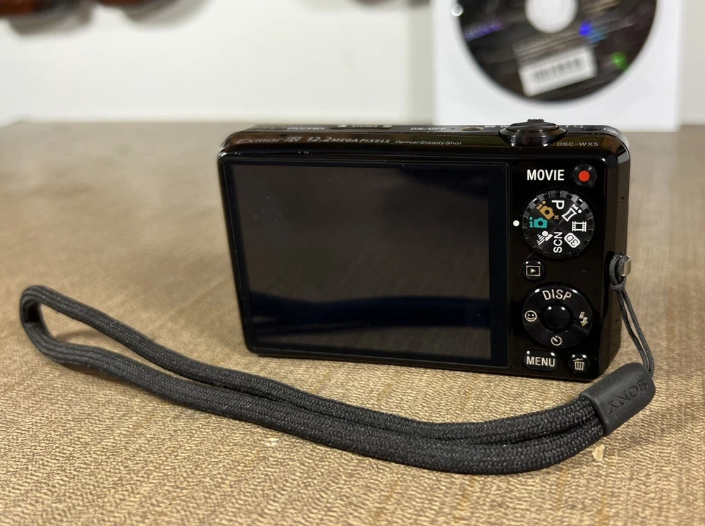 Sony Cyber-Shot DSC-WX5 12.2 Megapixel 5x Optical Zoom Black Digital Camera with carrying case, manual, CD software, charger, two batteries, & AV USB cable. Tested & working. Preowned used condition - some damage to top left corner & splitting on top (doesn’t affect camera) - please use photos for references. Order will be shipped via USPS. Please message any questions or concerns.
