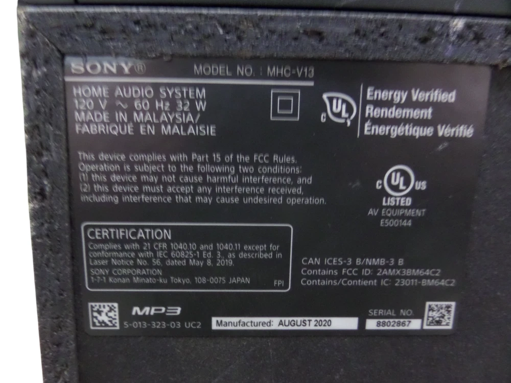 Model: MHC-V13 gtin13: Does Not Apply Seller Notes: “Used , Good working (Audio cable, and Antenna not included )” Type: Party Speaker UPC: Does Not Apply Connectivity: Wireless MPN: MHC-V13 Brand: Sony