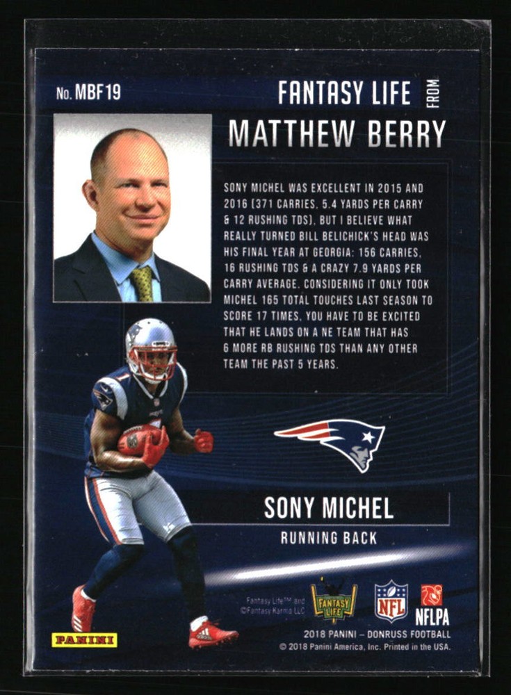Set: Donruss Season: 2018 Team: New England Patriots League: NFL Sport: Football Year Manufactured: 2018 Player/Athlete: Sony Michel Manufacturer: Donruss Type: Sports Trading Card Parallel/Variety: Matthew Berry's Fantasy Life Autographed: No Graded: No Card Number: MBF19