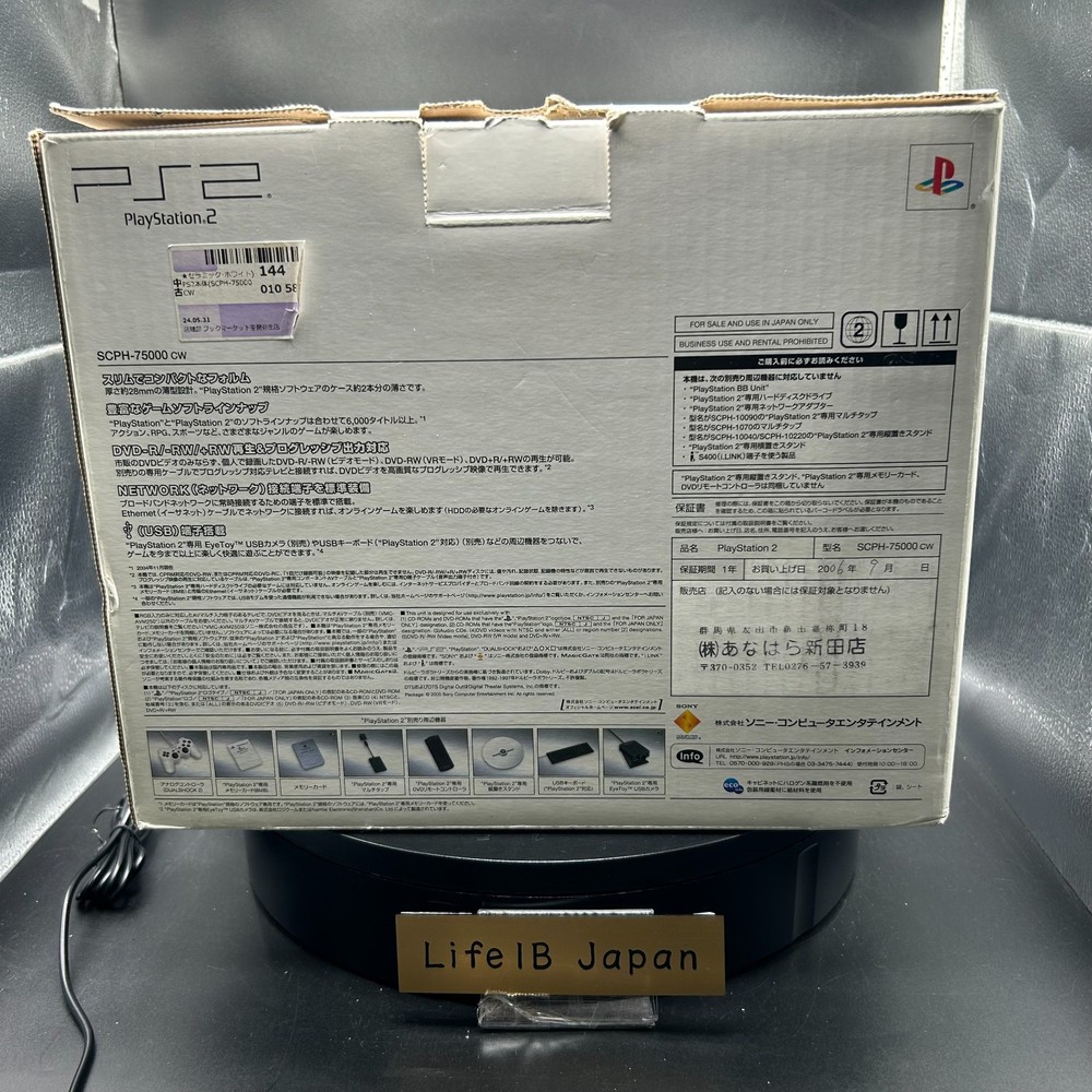 Sony PlayStation 2 PS2 Slim SCPH-75000 CW Ceramic White Console System Description Condition: Used Language: Japanese This is the Japanese version. This is the Japanese version, so please make sure it is compatible with the product in your country before purchasing. If it is region locked, please unlock it yourself. The Sony PlayStation 2 Slim SCPH-75000 CW Ceramic White Console System is a sleek and compact version of the iconic PS2, offering a refined design and enhanced functionality. This limited-edition Ceramic White model is highly sought after by collectors and gaming enthusiasts. Experience an extensive library of legendary PlayStation 2 games with smooth performance and stylish aesthetics. Product Details: Brand: Sony Model: PlayStation 2 Slim (SCPH-75000 CW) Color: Ceramic White Power Supply: 100V (Requires a voltage converter for regions with different voltage) Dimensions: Approx. 230mm × 28mm × 152mm (W × H × D) Weight: Approx. 900g Media Compatibility: PlayStation 2 discs, PlayStation 1 discs, and DVD playback Connectivity: AV Multi Out, Digital Optical Out, Ethernet (Broadband Adapter required for online play) Controller Ports: 2 (Compatible with DualShock 2 controllers) Memory Card Slots: 2 (Supports PS2 memory cards) Features: Slim and lightweight design for easy portability and space-saving storage. Backward compatibility with original PlayStation 1 games. DVD playback functionality for multimedia entertainment. Supports a vast selection of PlayStation 2 games, including exclusive titles. Stylish Ceramic White finish, a rare color variant exclusive to Japan. This Sony PlayStation 2 Slim SCPH-75000 CW is perfect for those looking to relive classic gaming moments or add a unique console to their collection. Shipping We will send the item by FedEx, DHL, SpeedPAK, or Japan Post. We always send the item with a tracking number, So please place an order without any concern on delivery. You can always track the delivery status. Delivery date: 5-10 business days to US(FedEx and DHL), 8-12 days to US(SpeedPAK), 10-20 days to US(Japan Post). Delivered to all countries within 5 -20business days. Shipping is only available to the address registered in eBay. If you want us to send another address, please change your address on eBay and then place an order. Shipping is available from Monday to Friday. Weekends are not available because freight companies are closed. ?Delivery may be delayed due to the weather, customs clearance, and conditions of the destination country. The delivery method may change depending on the country. International Buyers - Please Note: Import duties, taxes, and charges are not included in the item price or shipping cost. These charges are the buyer's responsibility. Please check with your country's customs office to determine what these additional costs will be prior to bidding or buying. Thank you for your understanding.