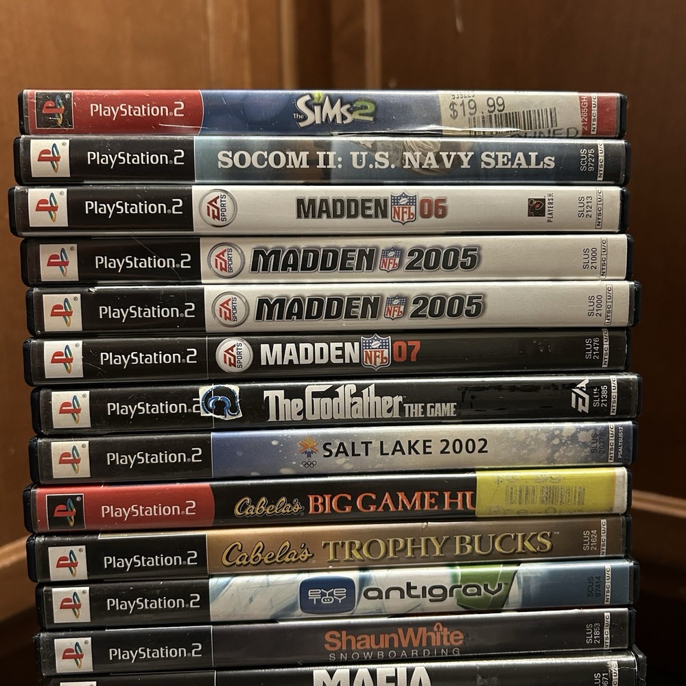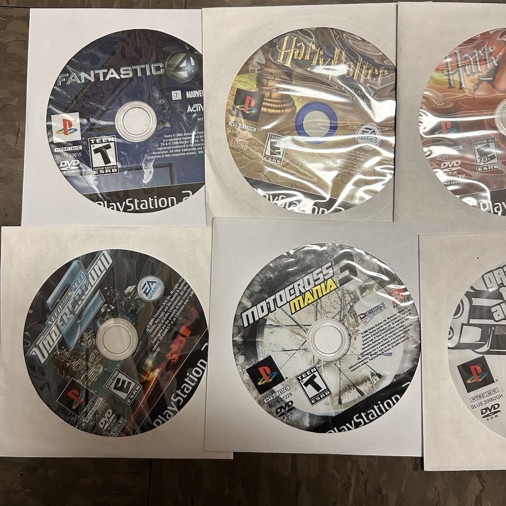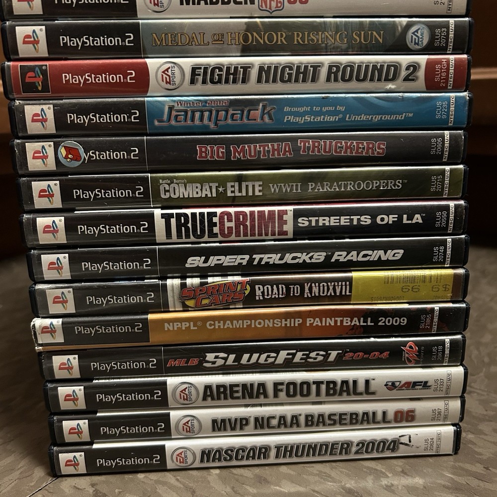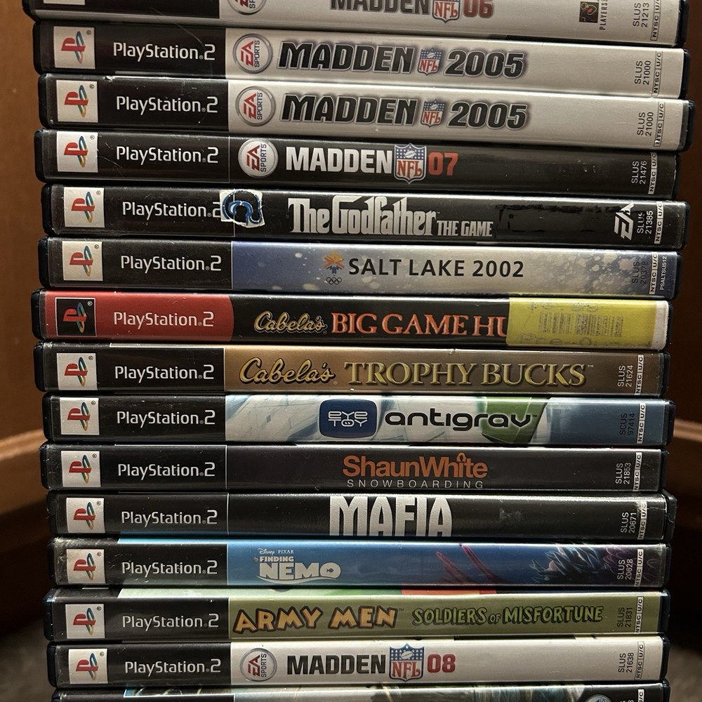 The games you will get in this lot include: PS1 Games: Moto Racer PS1 Disc ESPN Extreme Games PS1 Disc Nascar Racing PS1 Disc Champion Motocross 2001 PS1 Disc Knockout Kings 2000 CIB PS1 Supercross Circuit CIB PS1 NHL Rock The Rink PS1 CIB PS2 Games: Fantastic 4 Disc Harry Potter and the Chamber of Secrets Disc Harry Potter and the Goblet of Fire Disc Mercenaries 2 Disc Motocross Mania 3 Disc Need for Speed Underground 2 Disc (No Longer Included) Grand Theft Auto 3 Greatest Hits Disc Grand Theft Auto Vice City Disc Fight Night Round 3 Greatest Hits Disc Nascar Thunder 2004 CIB MVP 06 NCAA Baseball CIB Arena Football CIB MLB Slugfest 2004 Case & Disc Championship Paintball 2009 CIB (Disc has visible hairline cracks) Sprint Cars Road to Knoxville CIB Super Trucks Racing CIB Truecrime Streets of LA CIB Combat Elite WWII Paratroopers CIB Big Mutha Truckers CIB Winter 2002 Jampack CIB Army Men Soldiers of Misfortune CIB Finding Nemo OEM Case & Disc Mafia OEM Case & Disc Shaun White Snowboarding CIB Antigrav CIB Cabelas Trophy Bucks OEM Case & Disc Cabelas Big Game Hunter Greatest Hits CIB Salt Lake 2002 CIB The Godfather The Game CIB (No Longer Included) Madden 07 CIB Madden 2005 CIB Madden 2005 CIB Fight Night Round 2 Greatest Hits CIB Medal of Honor Rising Sun CIB Madden NFL 06 CIB Socom 2 US Navy Seals CIB The Sims 2 PS2 Greatest Hits OEM Case & Disc