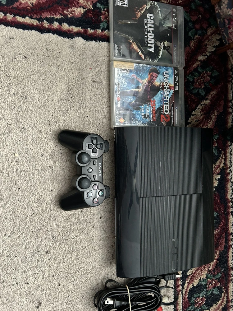 Sony PlayStation 3 PS3 Super Slim Black Console With Controllers, Cords, 2 Games. Condition is Used. Shipped with USPS Priority Mail.