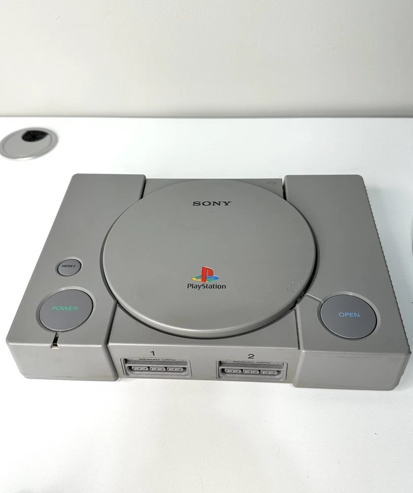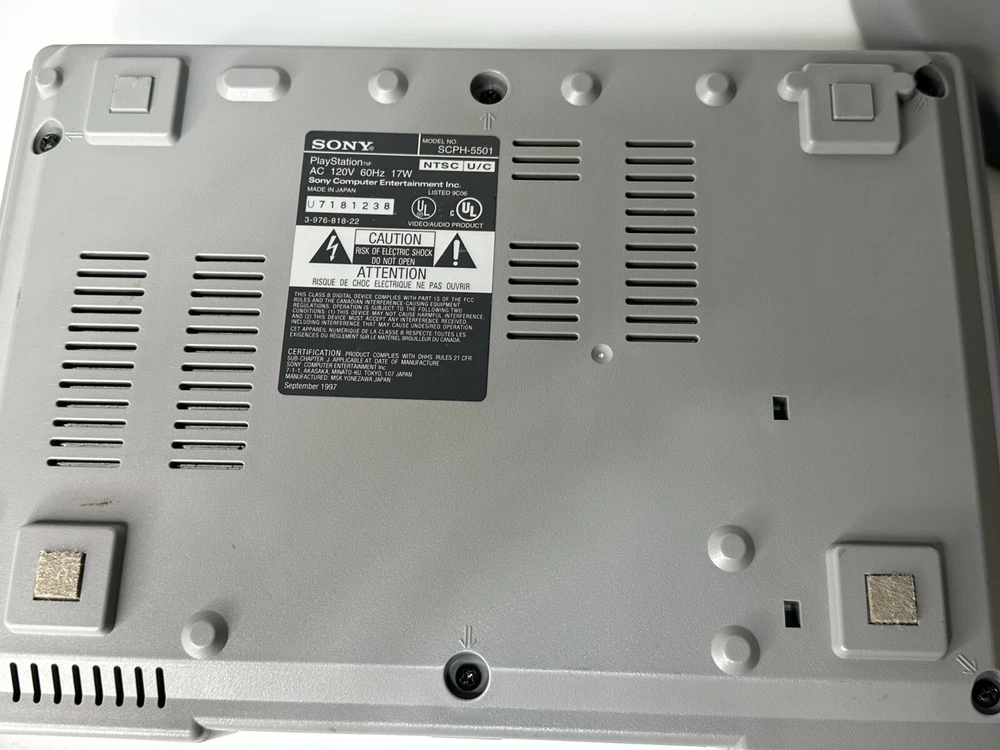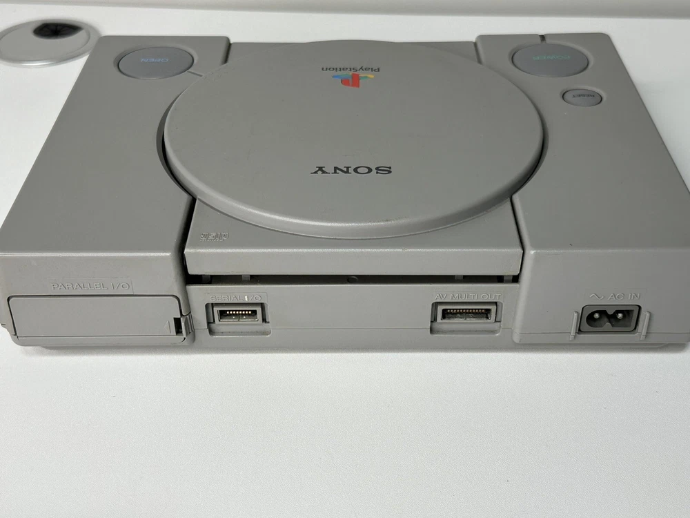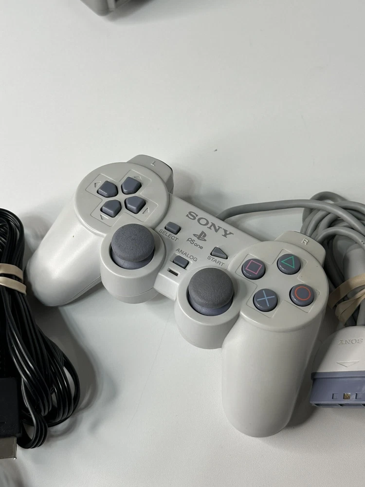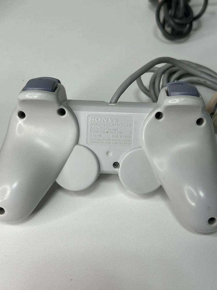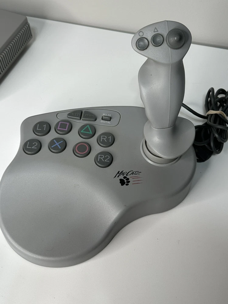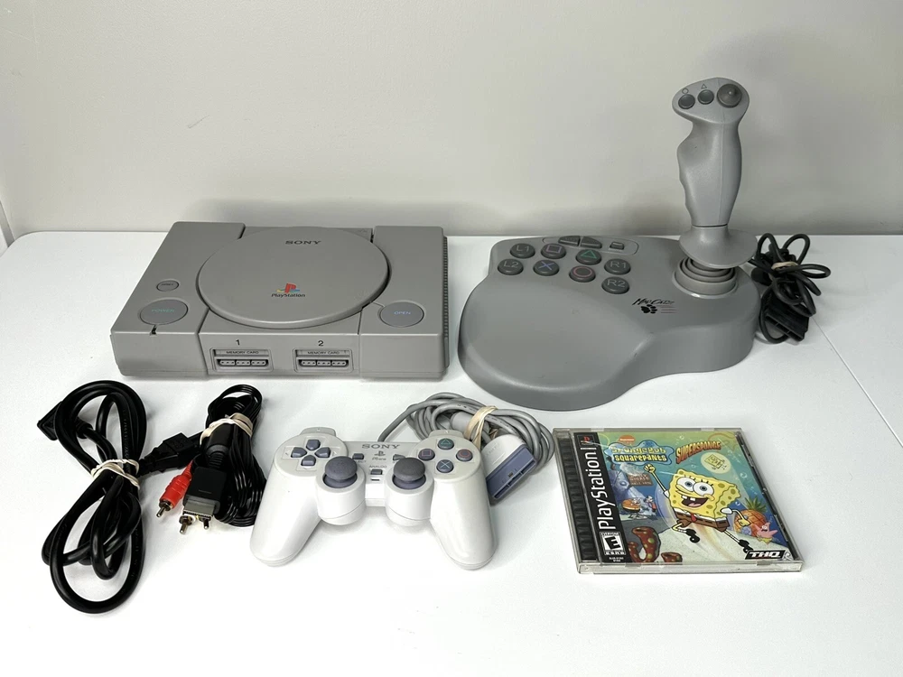 Bundle includes PS1 console Controller SCPH-110 Madcatz Flight Stick Controller Power cord- not original AV cable- not original SpongeBob SquarePants super sponge Game Everything has been tested and works as it should. There is a crack in the flight stick cover as shown in photos. This does not affect the controller at all.