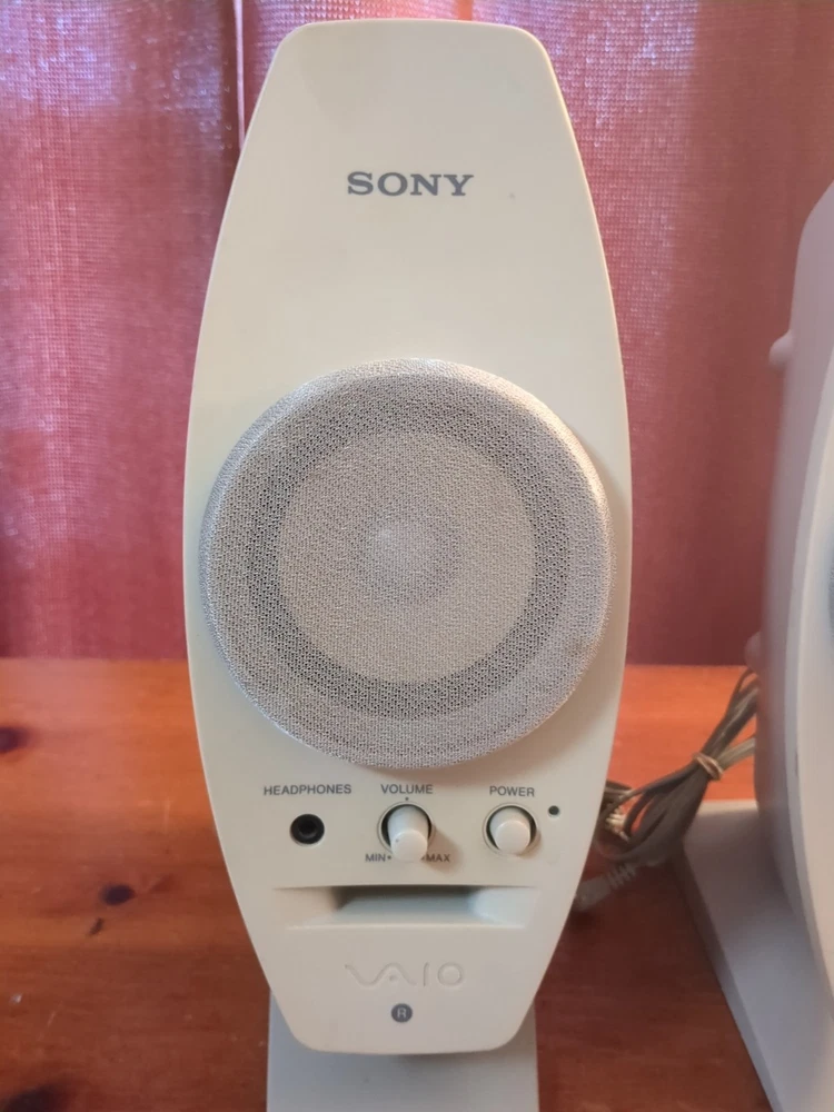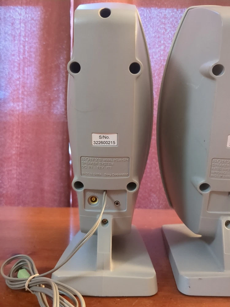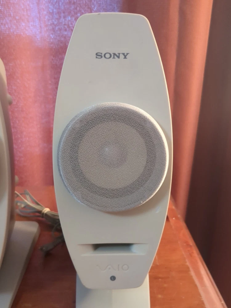 TESTED AND WORKING NEITHER SPEAKER IS BLOWN A/C ADAPTER INCLUDED 11 INCHES TALL SHIPPED WITH CARE Sony Vaio PCVA-SP4 Speakers are a wired set designed for desktop computers. The speakers include a left and right speaker unit along with an A/C adapter for power. Perfect for enhancing audio output on your Sony desktop computer.