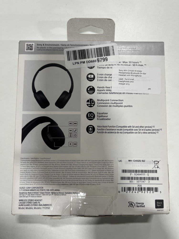 Type:Ear-Cup (Over the Ear)UPC:027242925205Features:Wirelessgtin13:027242925205Model:Sony WH-CH520MPN:WHCH520BConnectivity:BluetoothWireless Technology:BluetoothNumber of Earpieces:DoubleForm Factor:HeadbandColor:BlackBrand:Sony