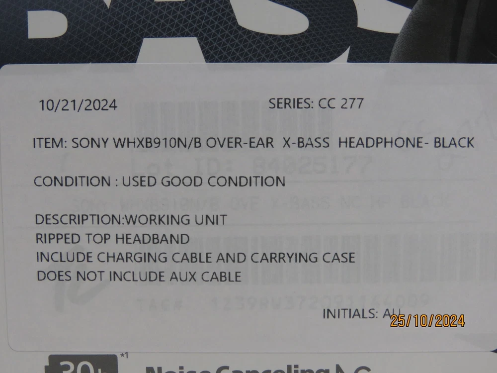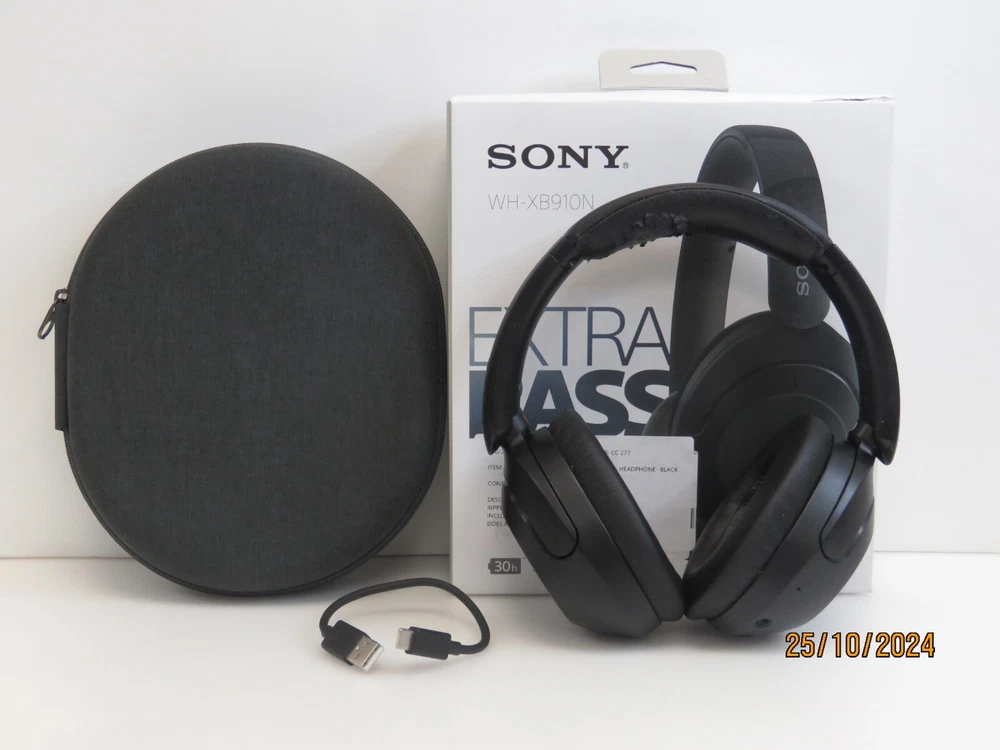 Sony WH-XB910N Bluetooth Noise Cancelling Wireless Headphones - Black Functional Condition: Tested and Functional. Ripped Top Headband Cosmetic Condition: This is a Used Item and Normal Wear (Scuffs & Scratches) is Expected. Items included in this listing: Headphones Charging Cable Case Items NOT included in this listing: Aux Cable Thank you for Shopping with Us! ENJOY Free Shipping in USA & Low Cost Shipping to CANADA! Terms of Sale NOTE: Our Listings only include items as pictured - Please do not assume any item is included if its not pictured. We will try our best to picture all items included in this listing as well as its cosmetic condition. We Guarantee & Stand Behind our product and commitment to provide you with o nly Original, Branded, OEM & Genuine Products Shipping A complete and correct shipping address is essential. We cannot guarantee the shipping address can be changed after checkout. Sales Tax will be charged to all Canadian & USA Buyers. Combined shipping is not guaranteed. We are unable to change any content of your order based on the eBay checkout note or PayPal message. Customers with shipping addresses outside of the U.S.A and Canada are responsible for all duties and import taxes. Please contact your customs for information Bidding All items are accurately described and pictured. Please ensure you are consciously bidding on the items as described. Payment Payments are expected at the time of purchase or in case of Auctions, at the end of auctions. Payments are managed via eBay Managed Payments Contact Us Your positive feedbacks are extremely valuable to us. If you have any concerns about your order, please contact us through eBay message to resolve any issues before leaving a negative feedback or opening a dispute. We will reply within 24 Hours Return Policy All items are in used condition unless specified.