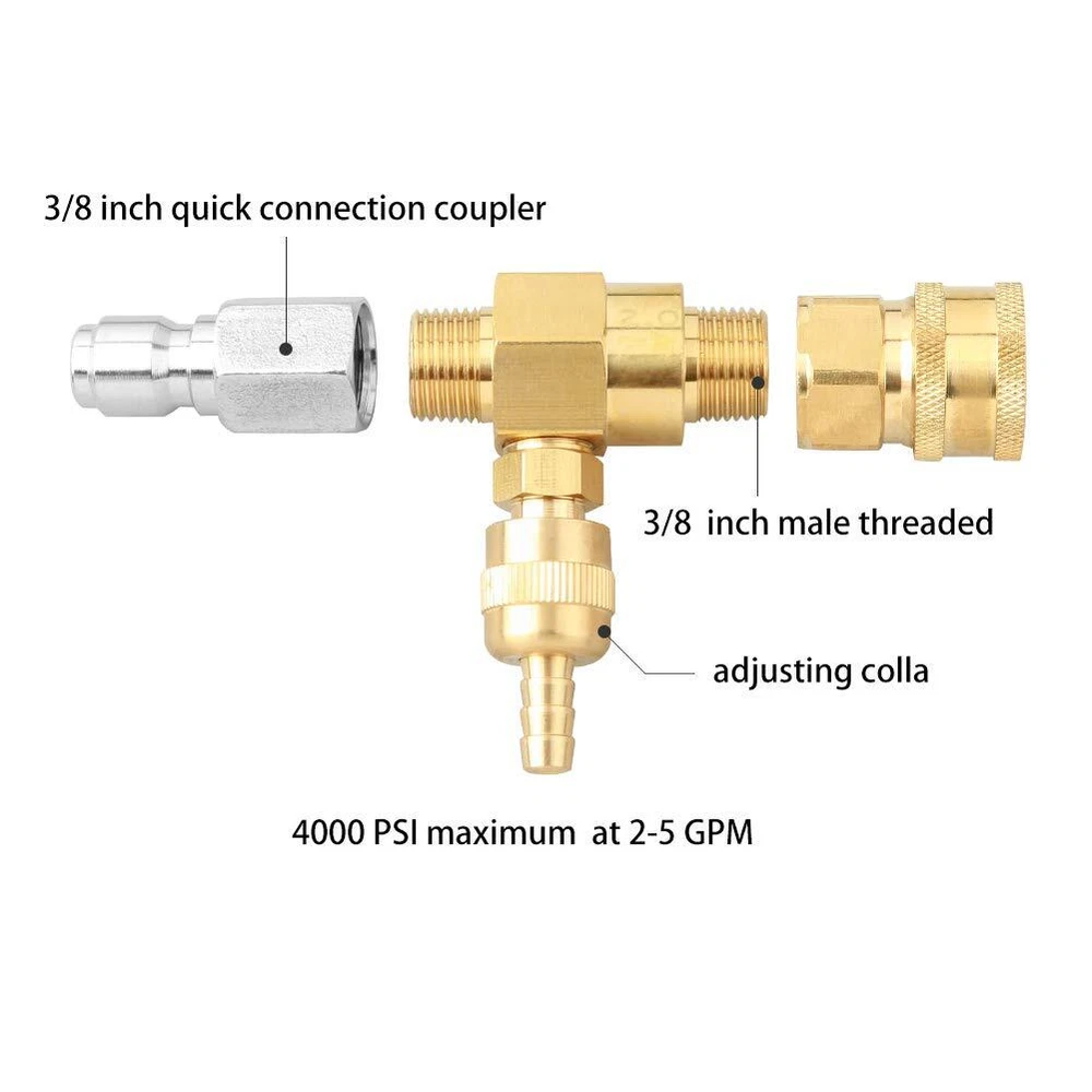 ✯Good Customer Service✯: Any quality or use problem,feel free to contact with us. The professional service team is always here for you. ★Specification: -Rated PSI: 2000-4000 PSI -Min GPM: 2 -Max GPM: 5 -3/8 inch quick disconnect fitting. ★Package Includes: -1 x Chemical Injector -1 x Siphon hose, 16 feet -1 x Filter -1 x 3/8 inch female snap coupler -1 x 3/8 inch male snap coupler -1 x 1/4 inch Black soap nozzle -2 x Teflon Tapes ★Application: -Used to draw the detergent out of a separate container. Running chemicals or soap after the pump will not damage the pump. Ideal for cleaning or spraying. ★Features: -Solid construction-Made of brass and stainless steel , the downstream injector is heavy duty to last a long time. -The soap dispenser kit is equipped with a screw-in valve that adjusts the dilution ratio and increases the efficiency of the pressure washer. -Our products are marked with flow arrows, pay attention to the flow arrows on the injector, and do not install them backwards. -16ft siphon hose with filter into the chemical container, allowing you to use a variety of chemicals without damaging your pump. ★Warnning: Do not point at face or other persons, and do not use close to surface. ❤【Premium Quality】Made of tough brass and stainless steel,resistant to corrosion and fading. ❤【Instructioin Manual】The maximum pressure is 4000 PSI. Flow arrows Marks on the injector and do not install it backwards. ❤【Kit Package】The chemical injector kit includes chemical injector, 16 feet tubing (siphon hose), filter and 1/4 inch quick connect black soap nozzle which connect to your gun or wand. ❤【Scientific Design】The soap dispenser kit is equipped with a screw-in valve that adjusts the dilution ratio of chemicals and water to increase the efficiency of your high pressure washers. ❤【Quality Assurance】Any problem,feel free to contact us.The professional team is always ready to serve you.
