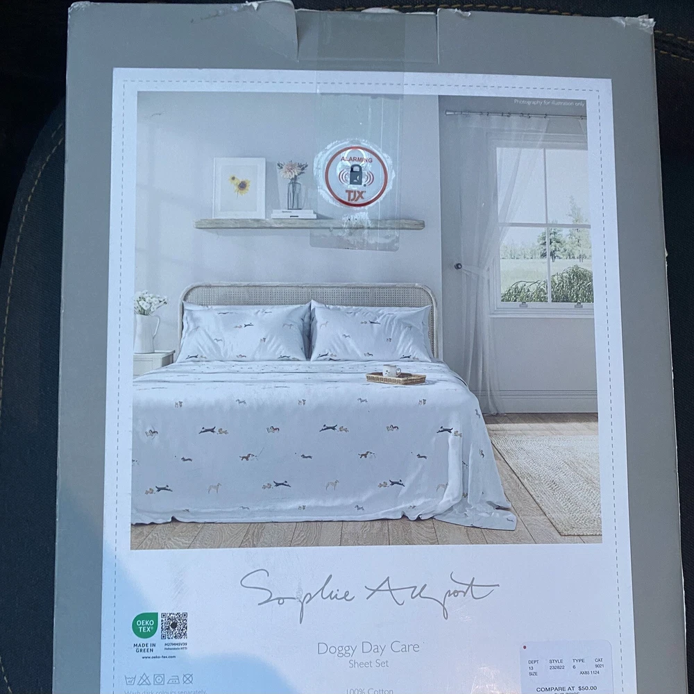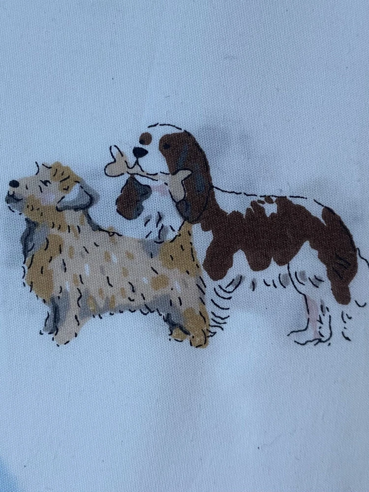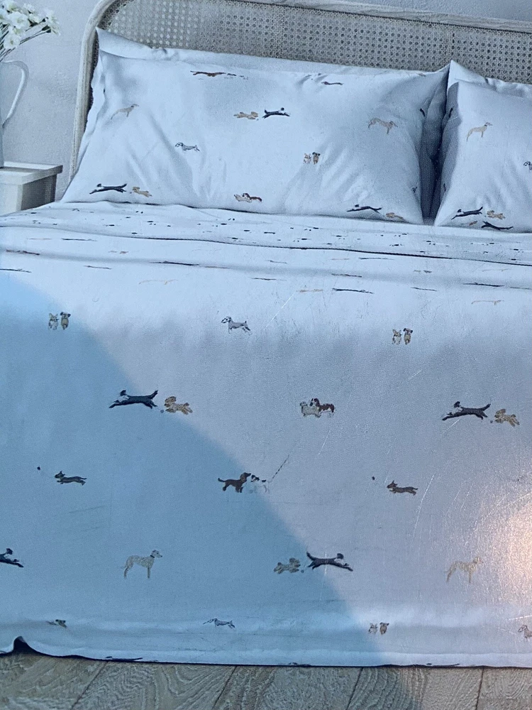 Make your bedroom feel like a cozy cottage with this Sophie Allport bed linen collection. The twin sheet set features a charming doggy daycare theme with adorable spaniel terrier designs in white. Made from high-quality linen material, this sheet set is machine washable and perfect for any dog lover. The set includes a flat sheet, fitted sheet, and pillowcase, all with a thread count of 200 or less. Add a touch of countryside charm to your bedroom with this delightful bedding set. See pics for measurements